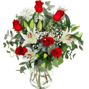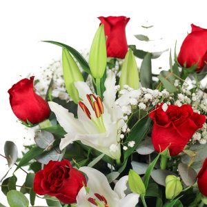 32,00 € - 48,00 €Rango de precios: desde 32,00 € hasta 48,00 €Ramo rosas rojas y lilium blanco