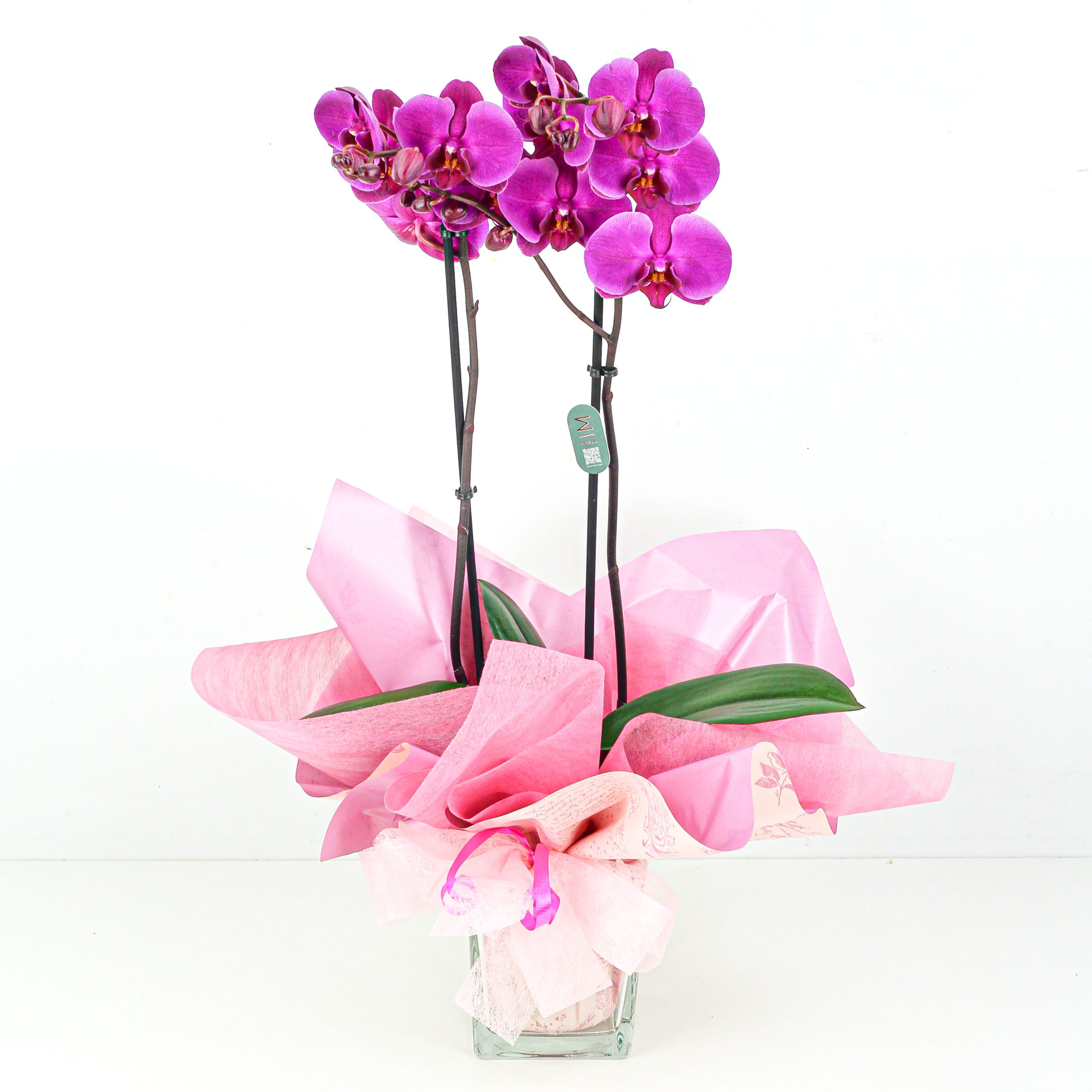 Planta de orquidea phalaenopsis color magenta de dos tallos, envuelta con un papel y un lazo decorativo en una base de cristal.