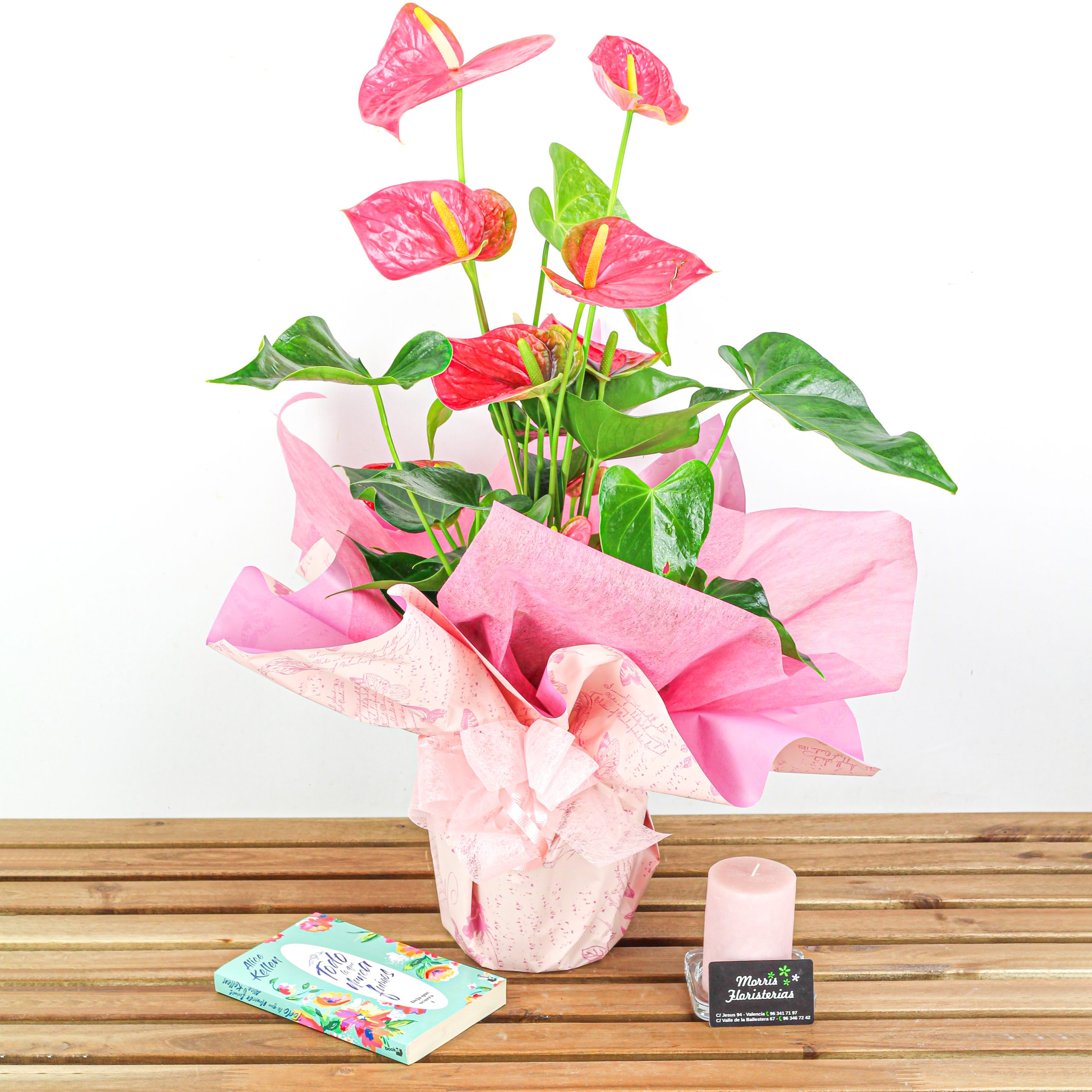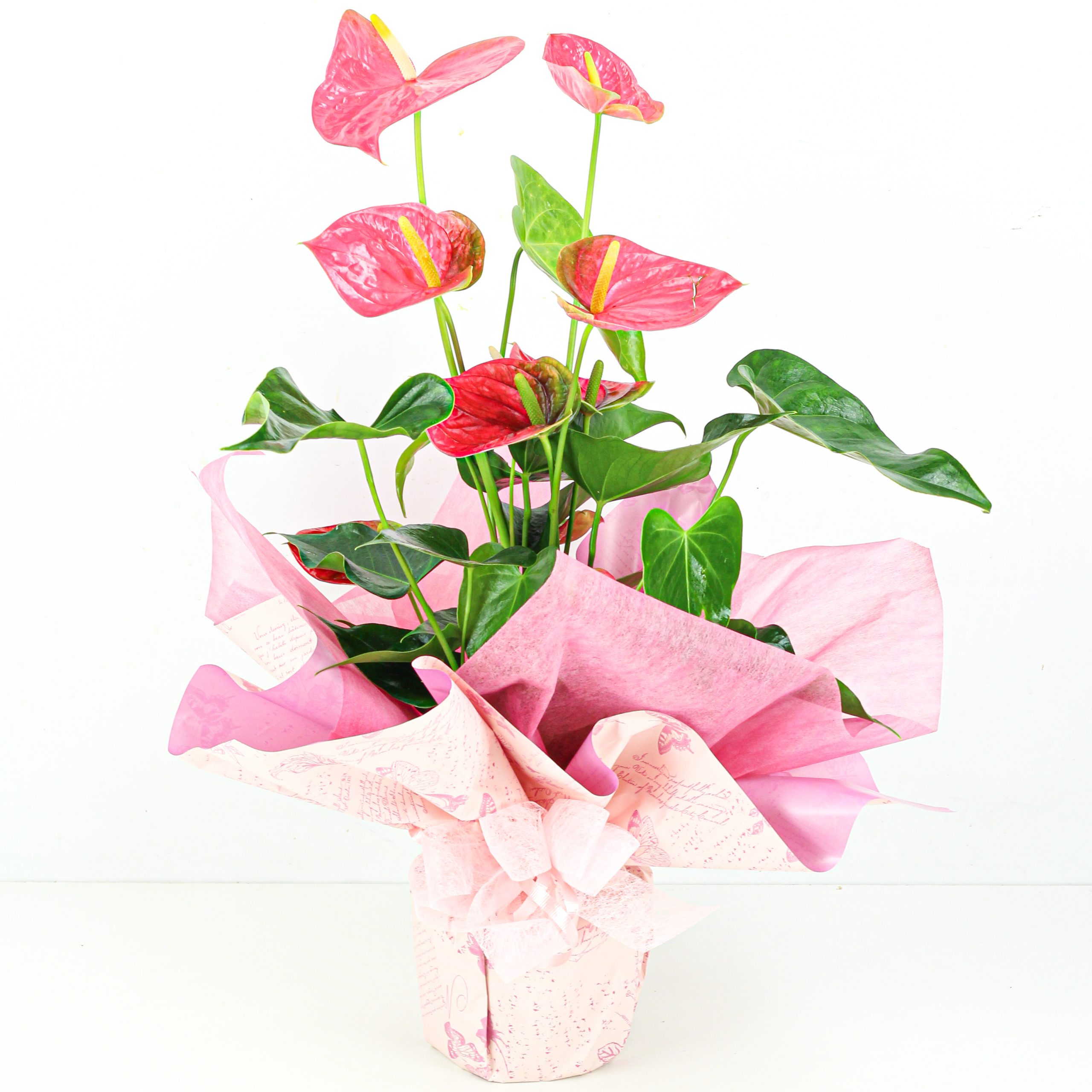 Planta de Anthurium color rosa envuelta en un papel y un lazo decorativo. Esta planta tiene una altura aproximada de 60 cm.