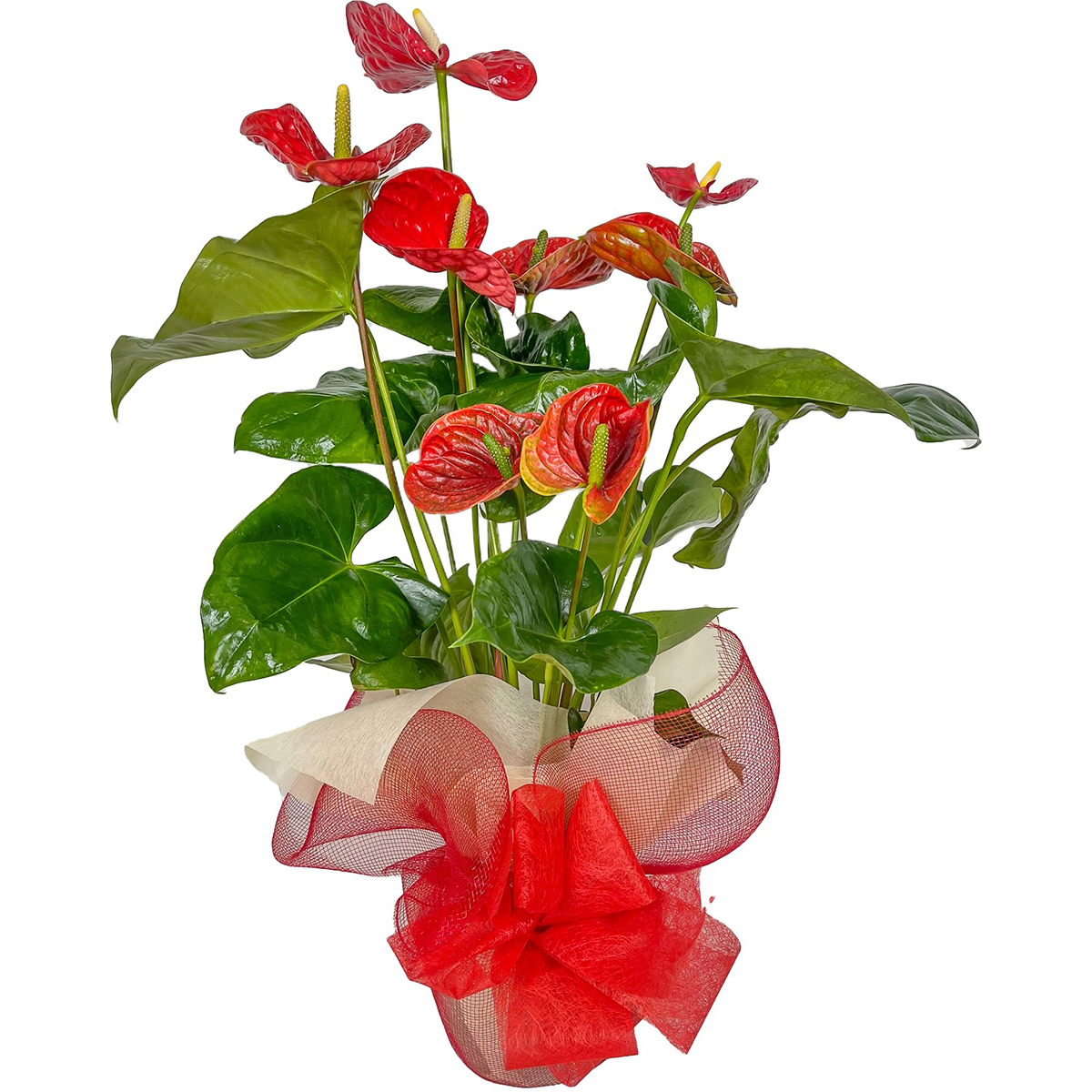 El Anthurium viene envuelto con un delicado papel decorativo en tonos blanco marfil y un gran lazo rojo de malla, que le da un acabado elegante y festivo, además de resaltar su belleza. Con su diseño cuidado y su presentación impecable, esta planta Anthurium rojo es una joya natural envuelta para emocionar.