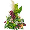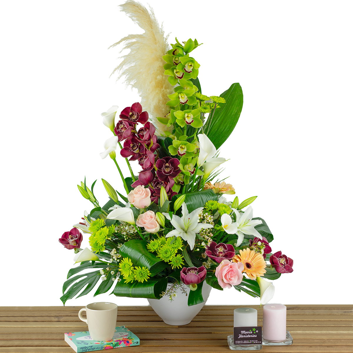 Centro de flores frescas recién cortadas compuesto con orquídeas cymbidium, lilium, rosas, gerberas, crisantemos, calas y un surtido de verdes elegantes.