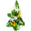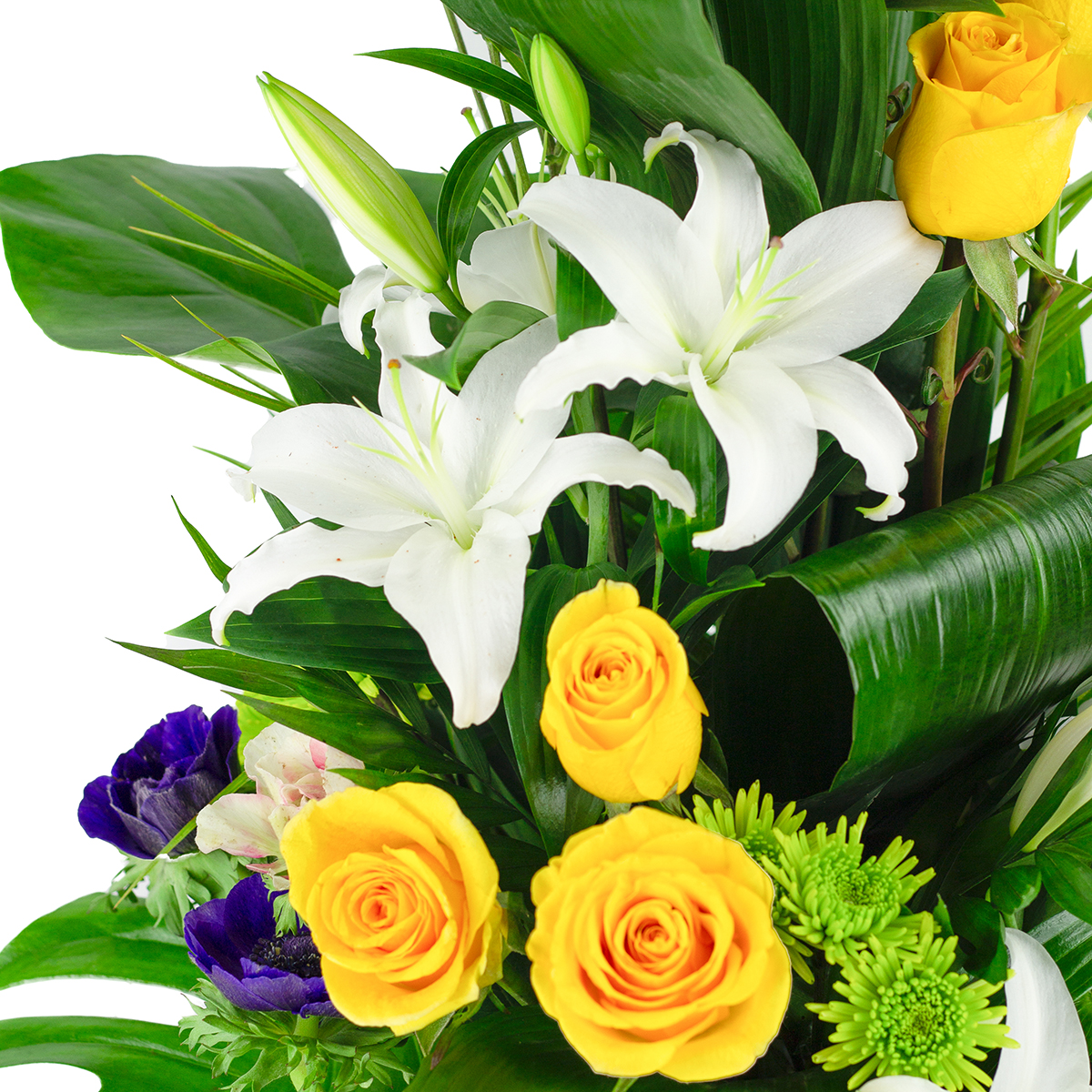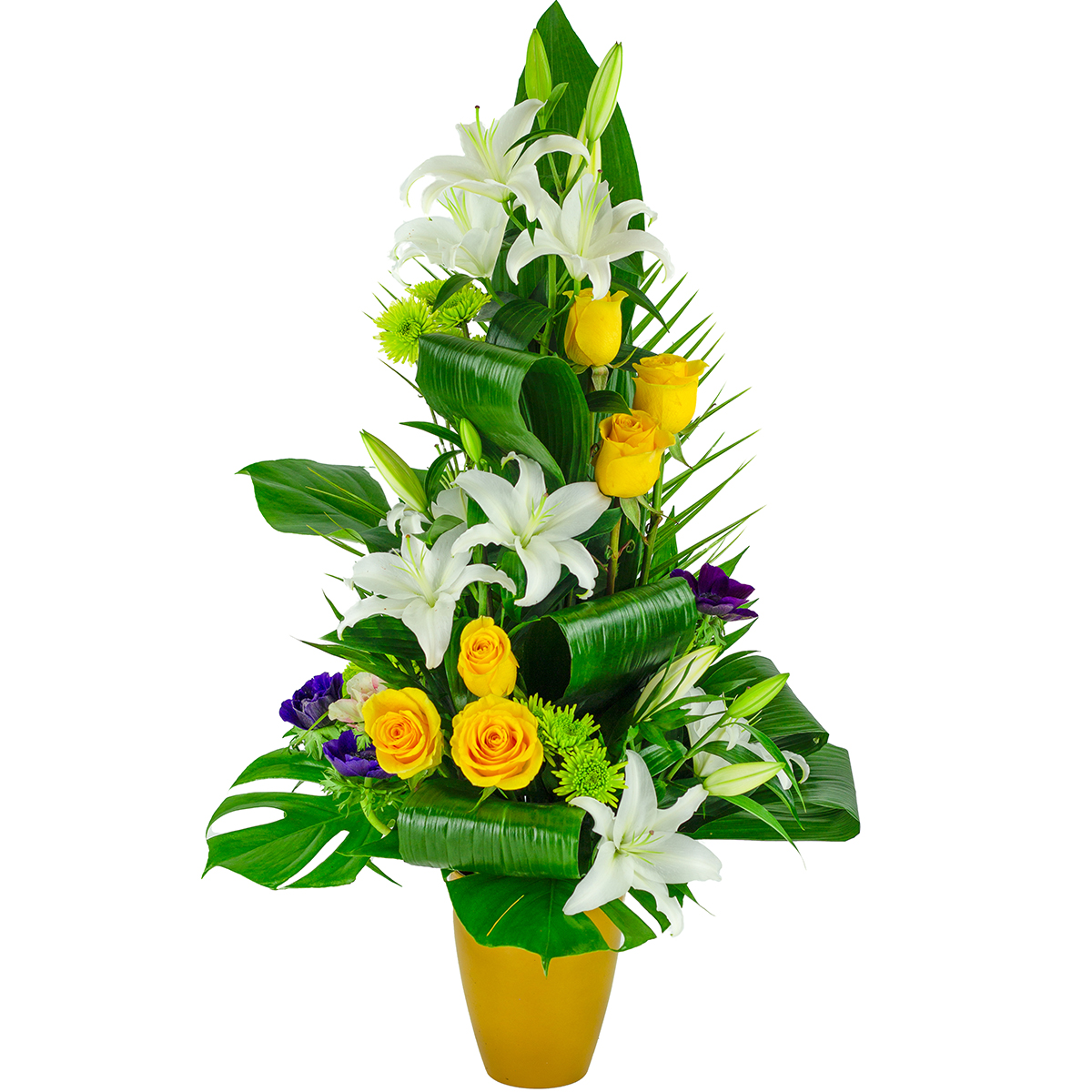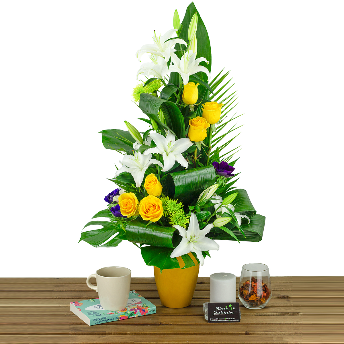 Descubre el poder de la elegancia en estado puro con este centro floral vertical de diseño contemporáneo, ideal para quienes buscan un arreglo imponente, equilibrado y lleno de vida. Elaborado por nuestros floristas profesionales con flores frescas y seleccionadas, este arreglo destaca por su composición ascendente, que combina lirios blancos, rosas amarillas, toques morados y un acompañamiento frondoso de verdes tropicales. La pureza de los lirios blancos, símbolo de respeto y paz, se entrelaza con la energía vibrante de las rosas amarillas, perfectas para transmitir alegría, amistad y vitalidad. El detalle en tonos morados aporta sofisticación y un contraste sutil que eleva el conjunto. Las hojas de monstera, palmas y aspidistra completan el diseño, aportando estructura, volumen y frescura visual.