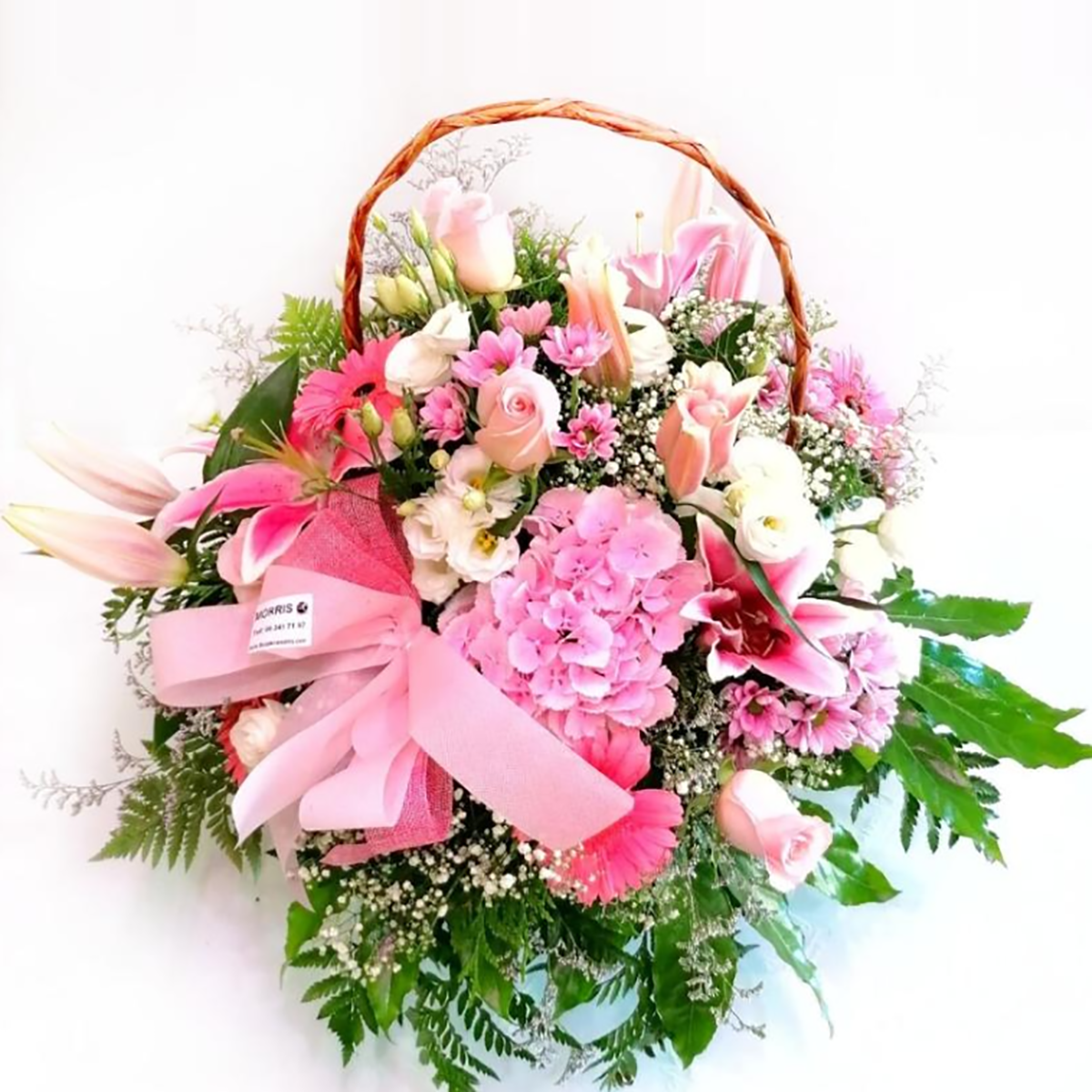 Esta elegante cesta de flores exóticas con diferentes tonalidades rosadas y blancas generan alegría y emoción en cualquier hogar. Este centro de flores es perfecto para celebraciones, cumpleaños y cualquier ocasión.