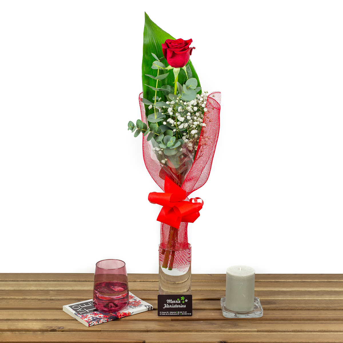 Este arreglo esta compuesto por una rosa roja natural de tallo largo con un toque de paniculata y un surtido de verdes variados.