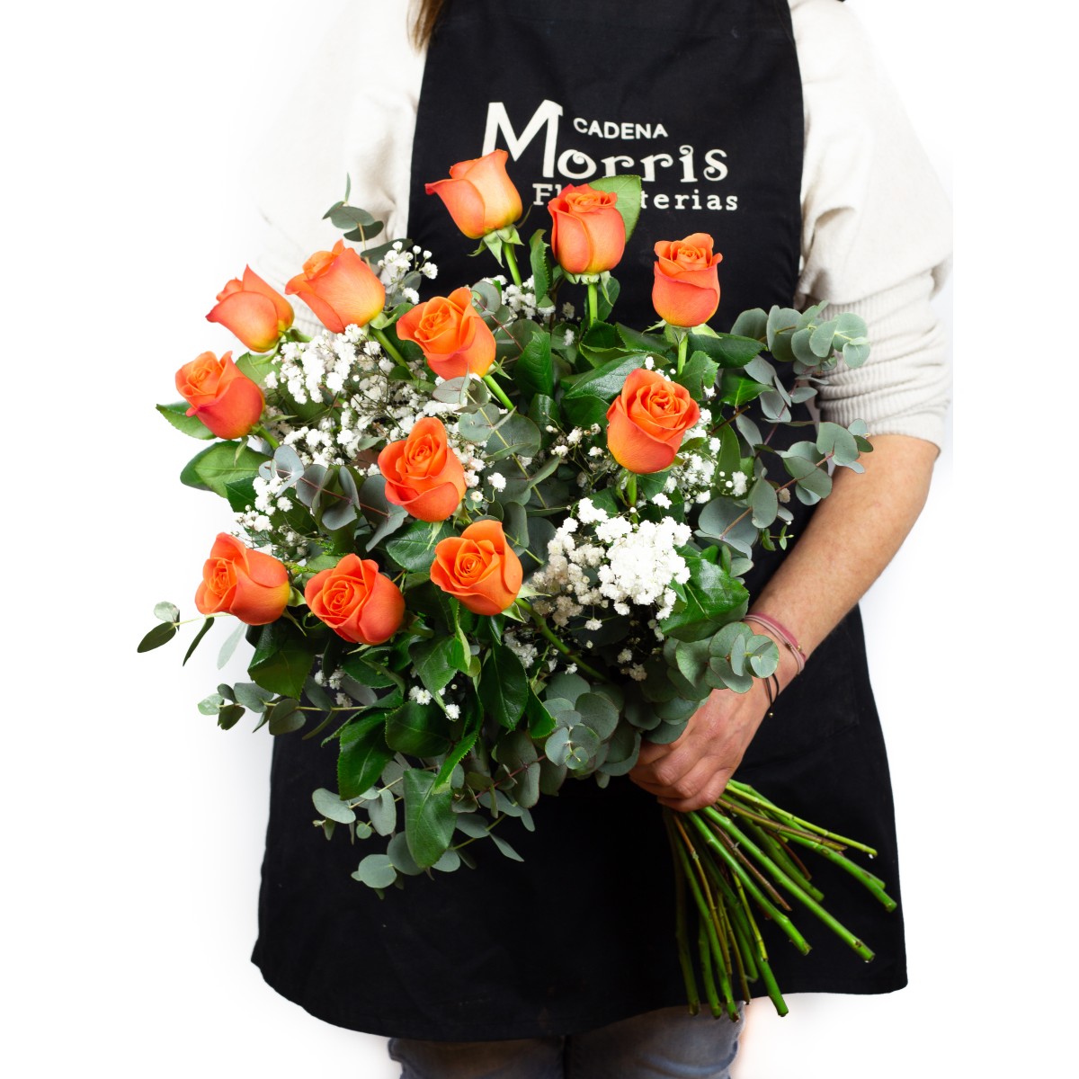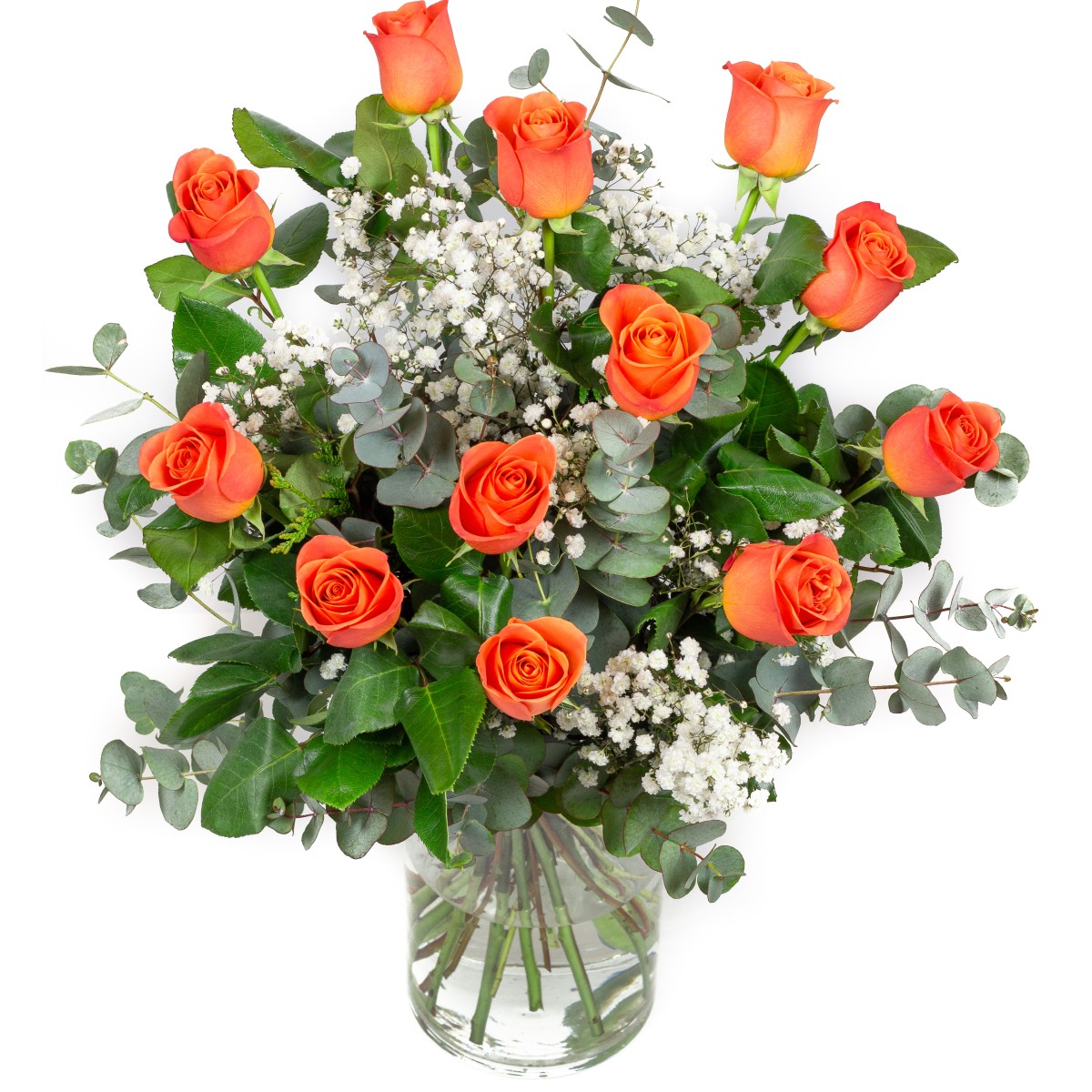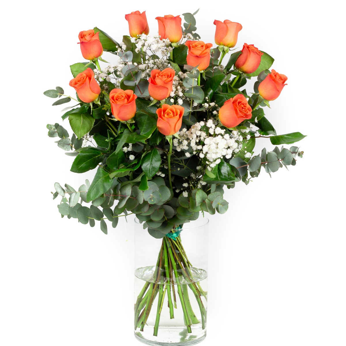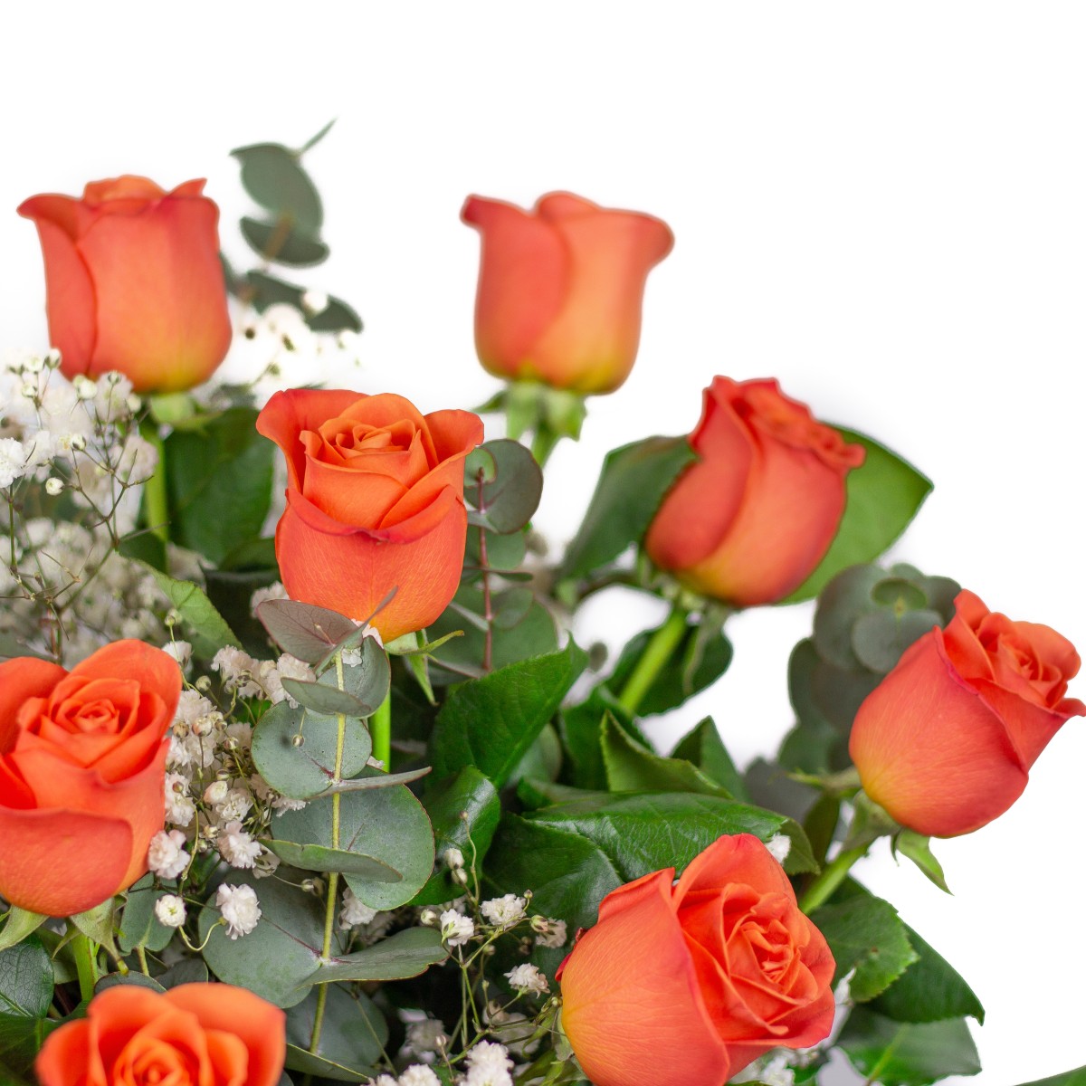 Ramo de rosas de tallo largo premium, de color naranja, frescas recién cortadas con paniculata y verdes.