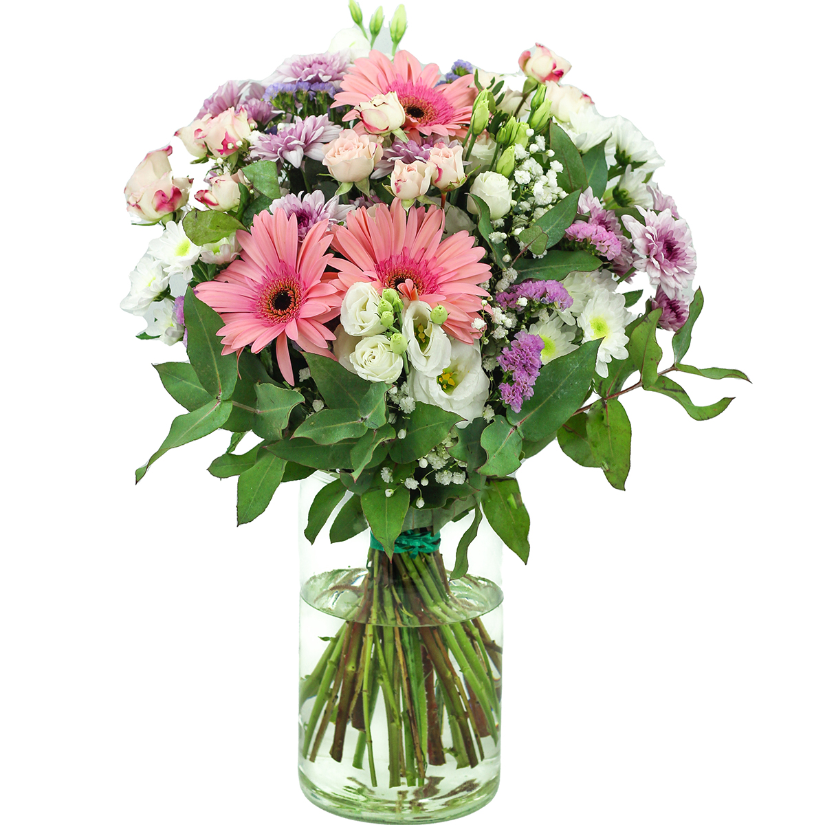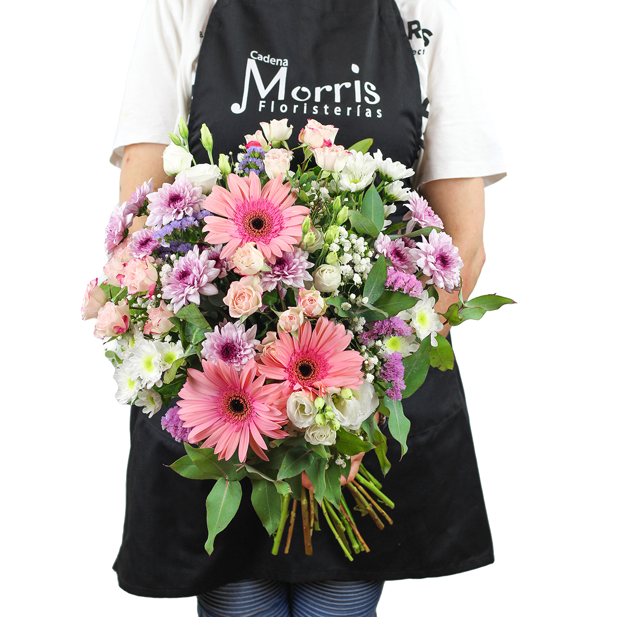 Ramo variado de flores frescas recién cortadas compuesto con rosas de pitimini, gerberas, margaritas, lithiantus, estatis y paniculata.