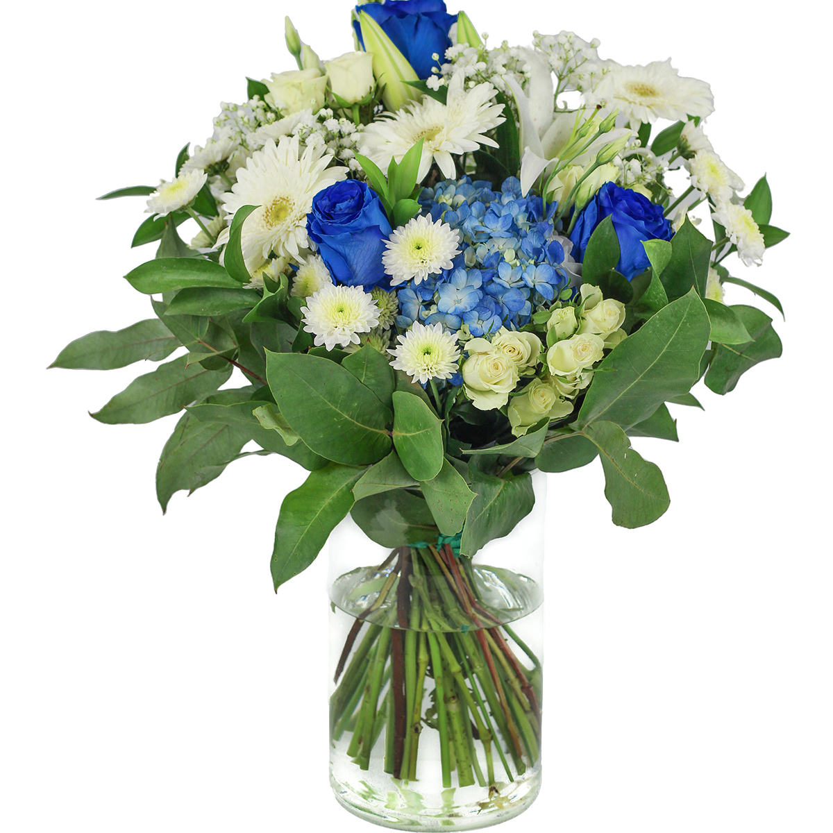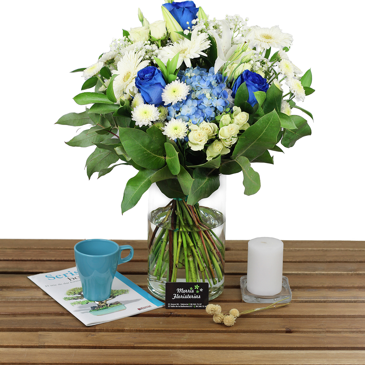 El color blanco le da a este precioso bouquet paz y serenidad, el azul y morado ofrece un bello contraste expresivo. Este elegante ramo de flores esta elaborado con la mejor selección de flores recién cortadas para que mantengan todo su aroma y color y se mantengan en buen estado durante mucho tiempo. Ideal para cualquier ocasion.