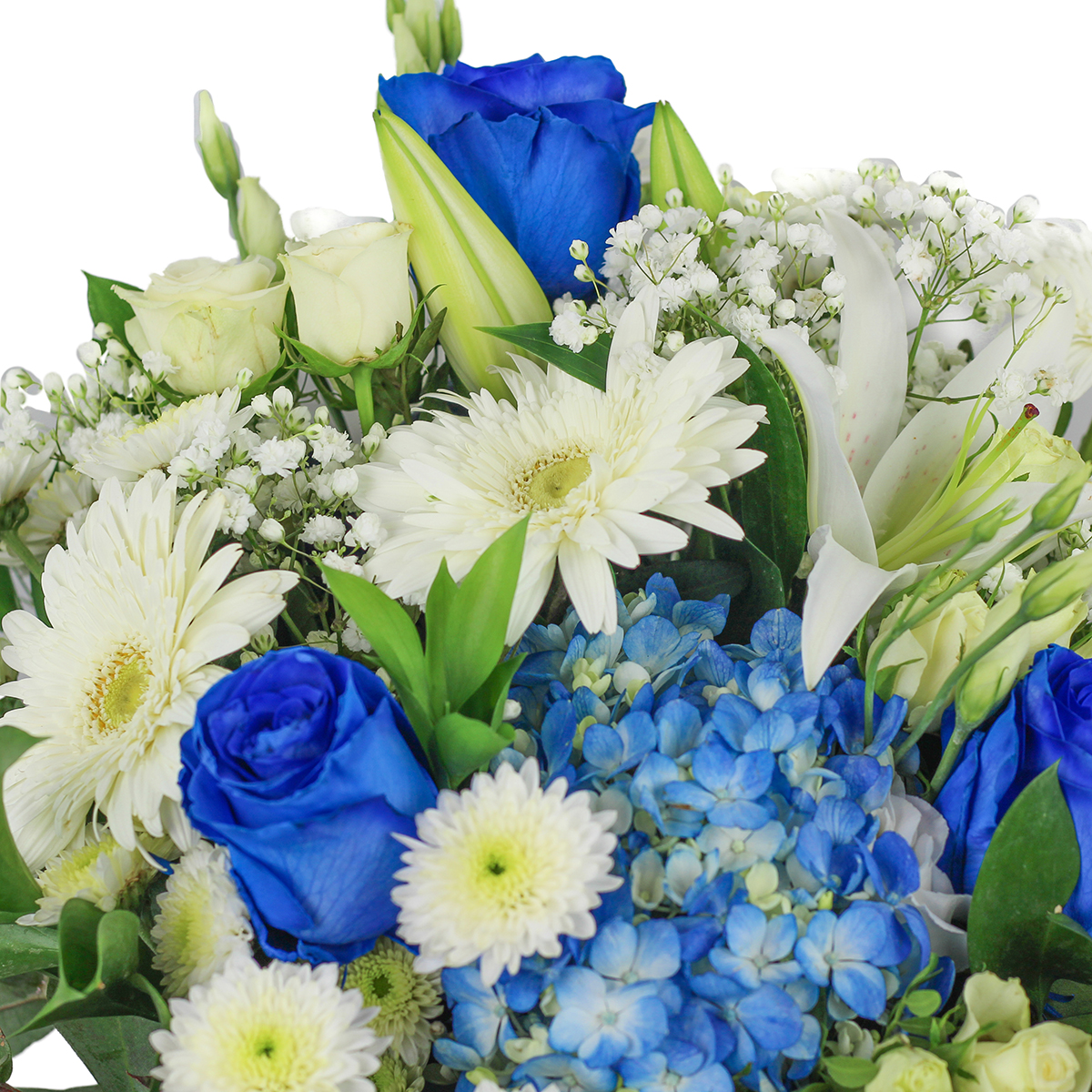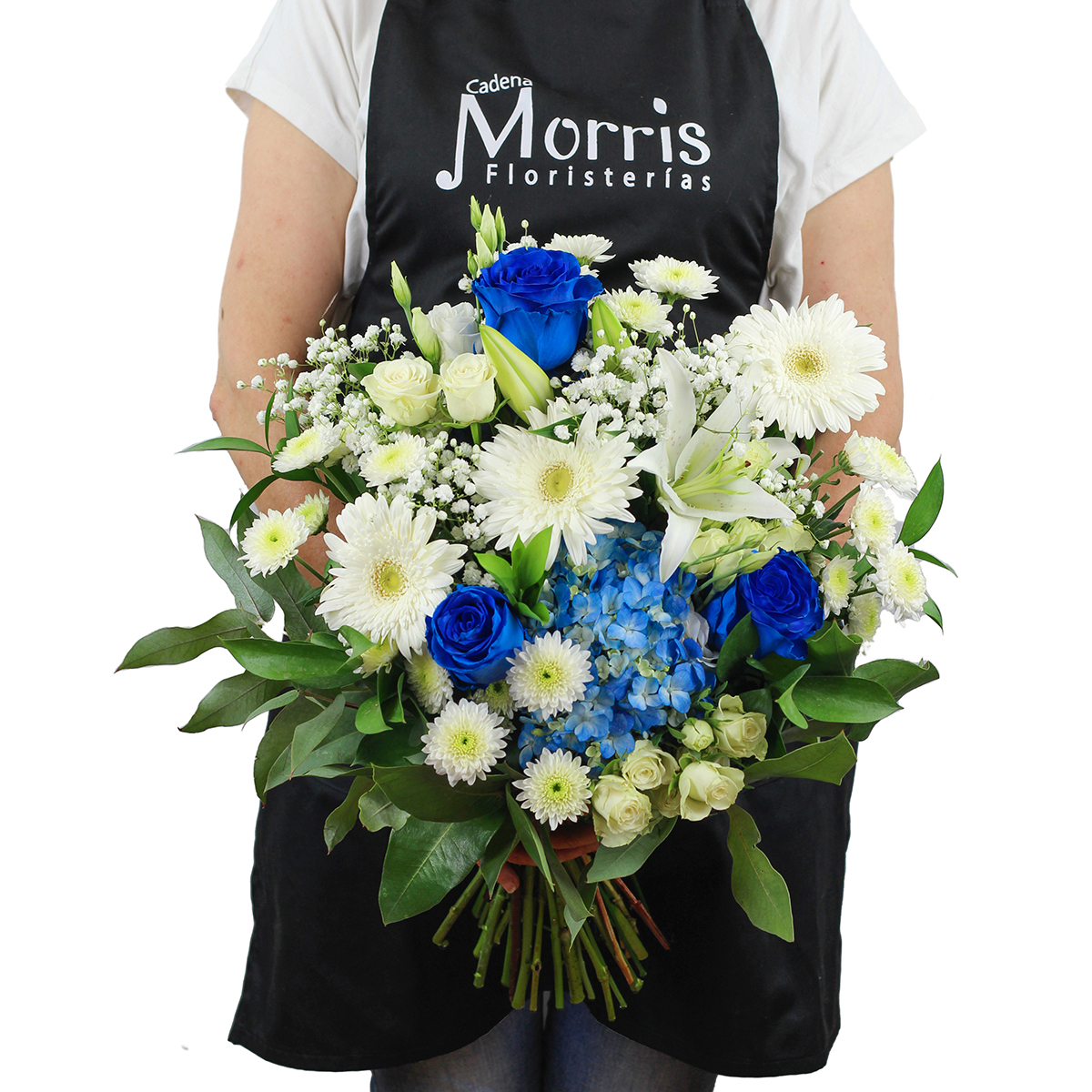 El ramo Azure tiene una mezcla preciosa de colores blancos con un toque azul. Este contraste de colores es una opción elegante que llamara la atención por esos tonos azules celestes tan exóticos.