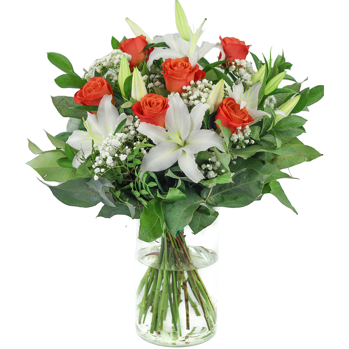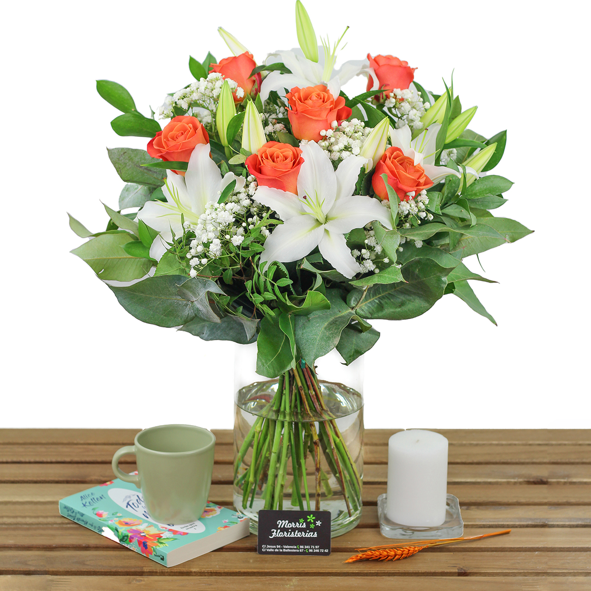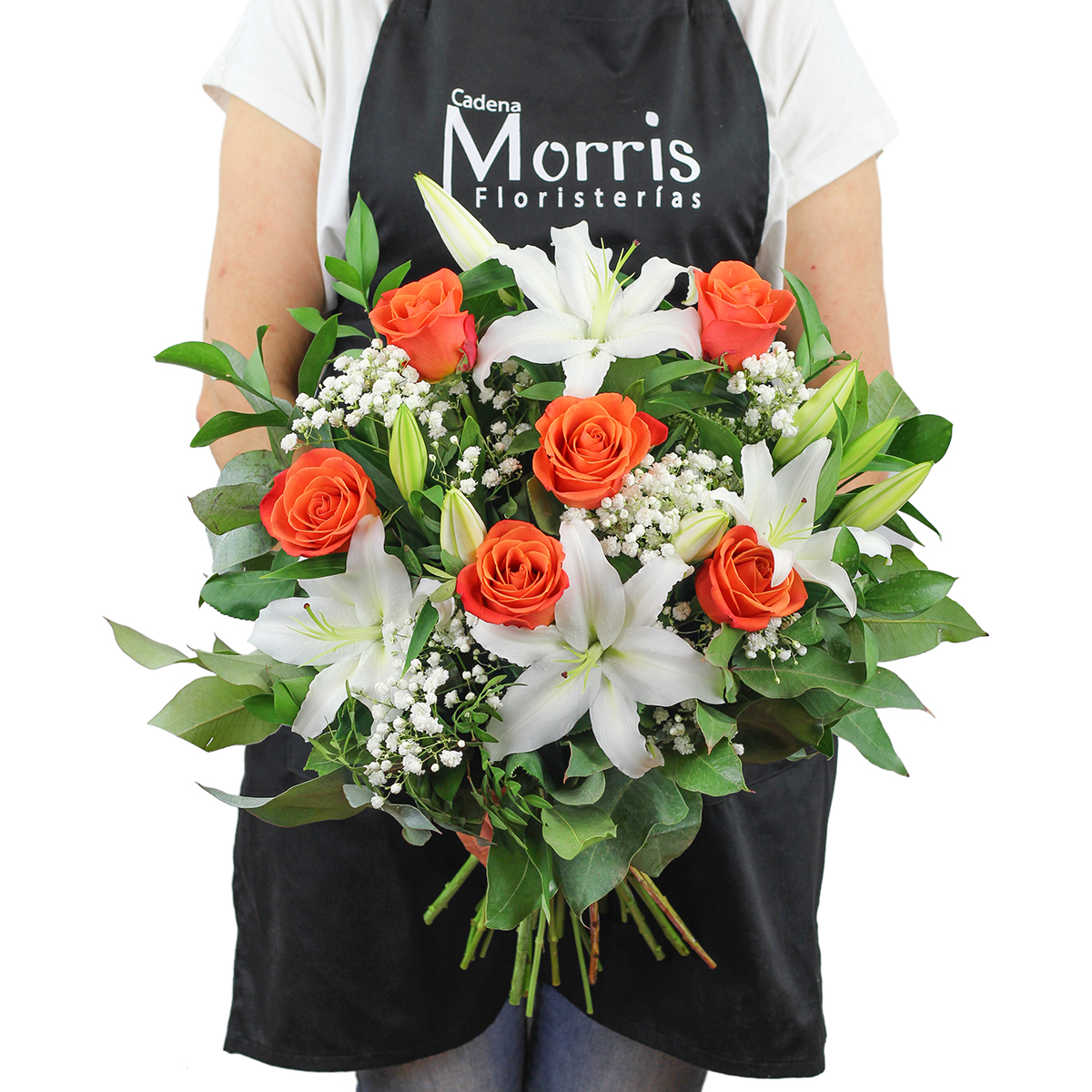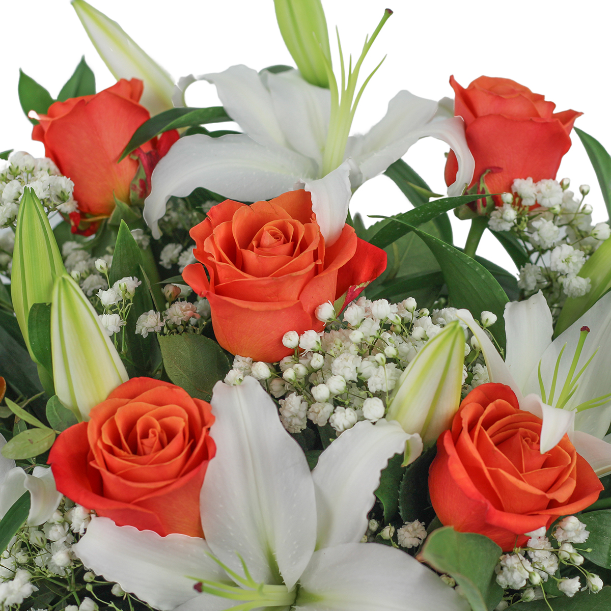 Ramo de flores frescas recién cortadas compuesto con lilium blanco, rosas naranjas, paniculata y un surtido de verdes variados. (Las imágenes son orientativas, las flores y los colores pueden variar de aquellos que aparecen en la imagen según su temporada o disponibilidad. Nuestros floristas profesionales pueden sustituirlos por otra alternativa similar en estilo, calidad y valor.)