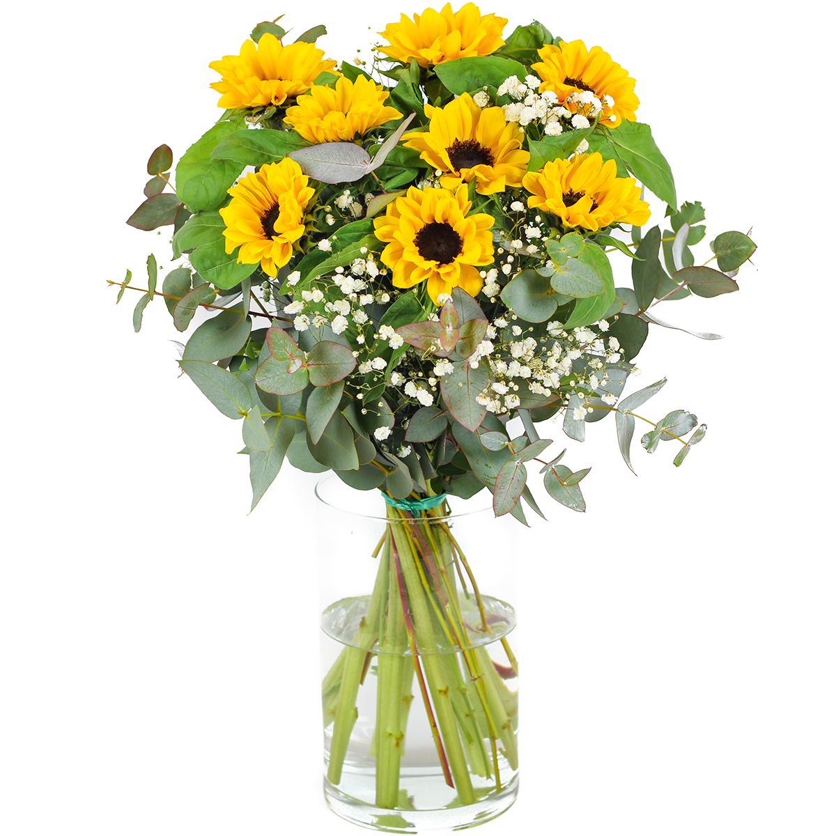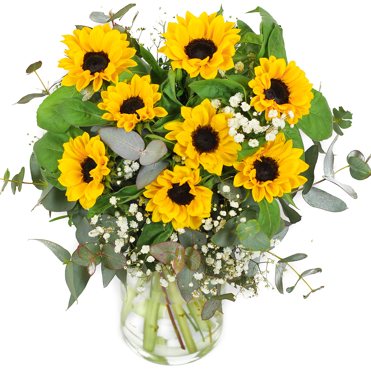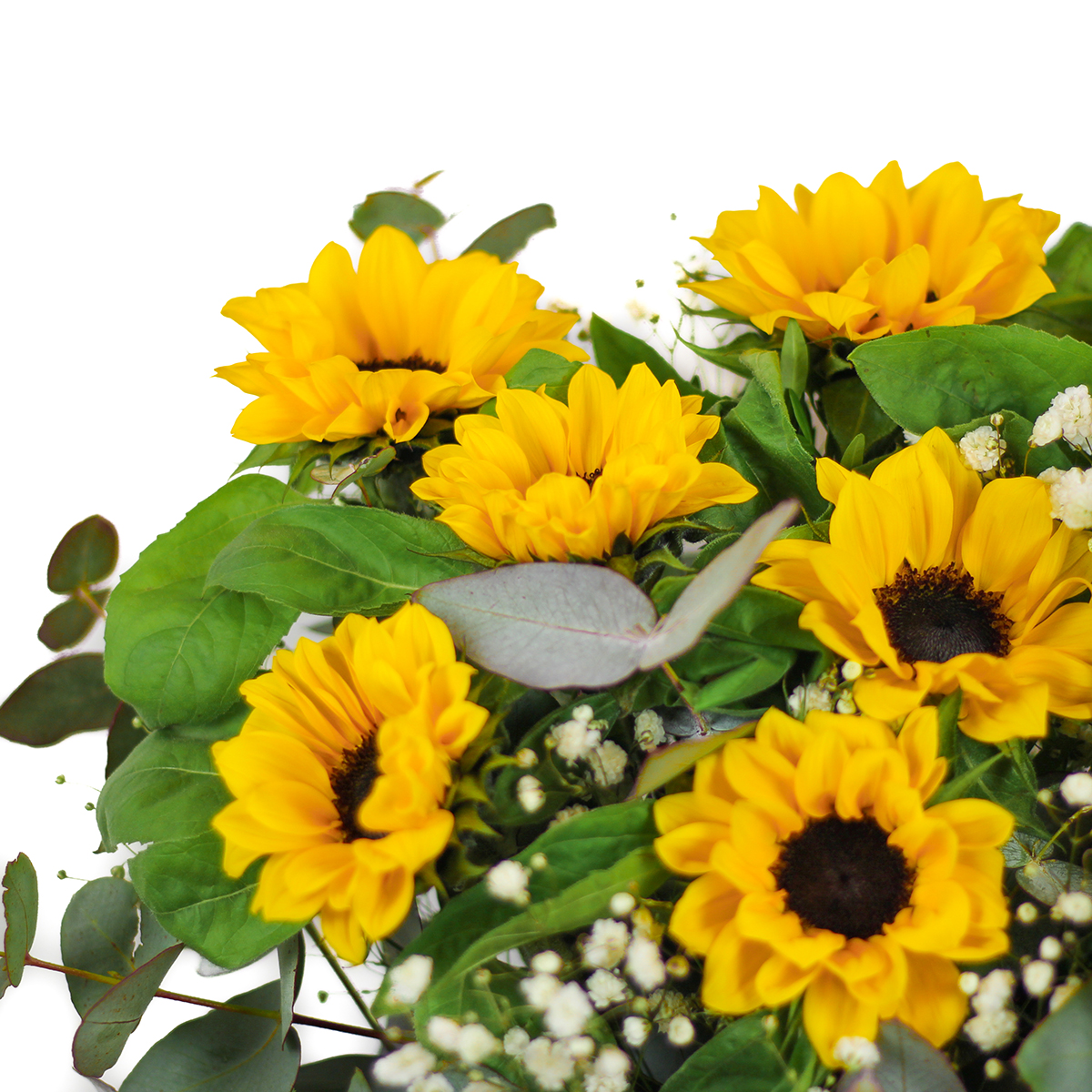 Este ramo de girasoles es un homenaje a la alegría, la vitalidad y la luz. El mismo se compone de una cuidada selección de girasoles frescos, perfectos para transmitir energía positiva y optimismo. Su diseño combina la fuerza del amarillo radiante de los girasoles con la delicadeza de la paniculata y la frescura del eucalipto, creando una composición armoniosa y vibrante. Cada girasol, símbolo de felicidad y admiración, ha sido seleccionado minuciosamente para garantizar su máxima frescura y belleza. Además, viene acompañado de hojas verdes exuberantes y ramitas de paniculata blanca que logran un contraste visual encantador, ideal para cualquier ocasión especial. Ya sea para celebrar un cumpleaños, felicitar a alguien o simplemente para iluminar un espacio con su calidez, los ramos de girasoles son una elección perfecta. Además, nuestro producto puede presentarse en un elegante jarrón de cristal (opcional), así como con otros complementos, si lo deseas, ¡solo tienes que indicárnoslo!