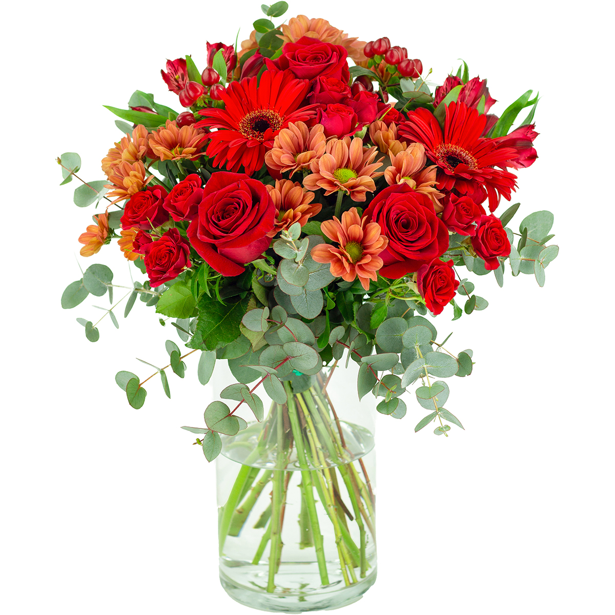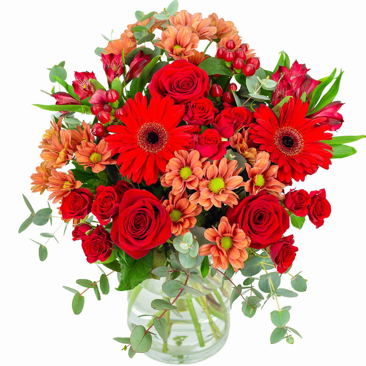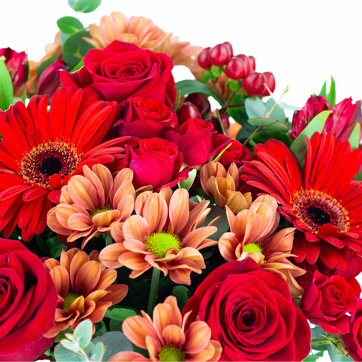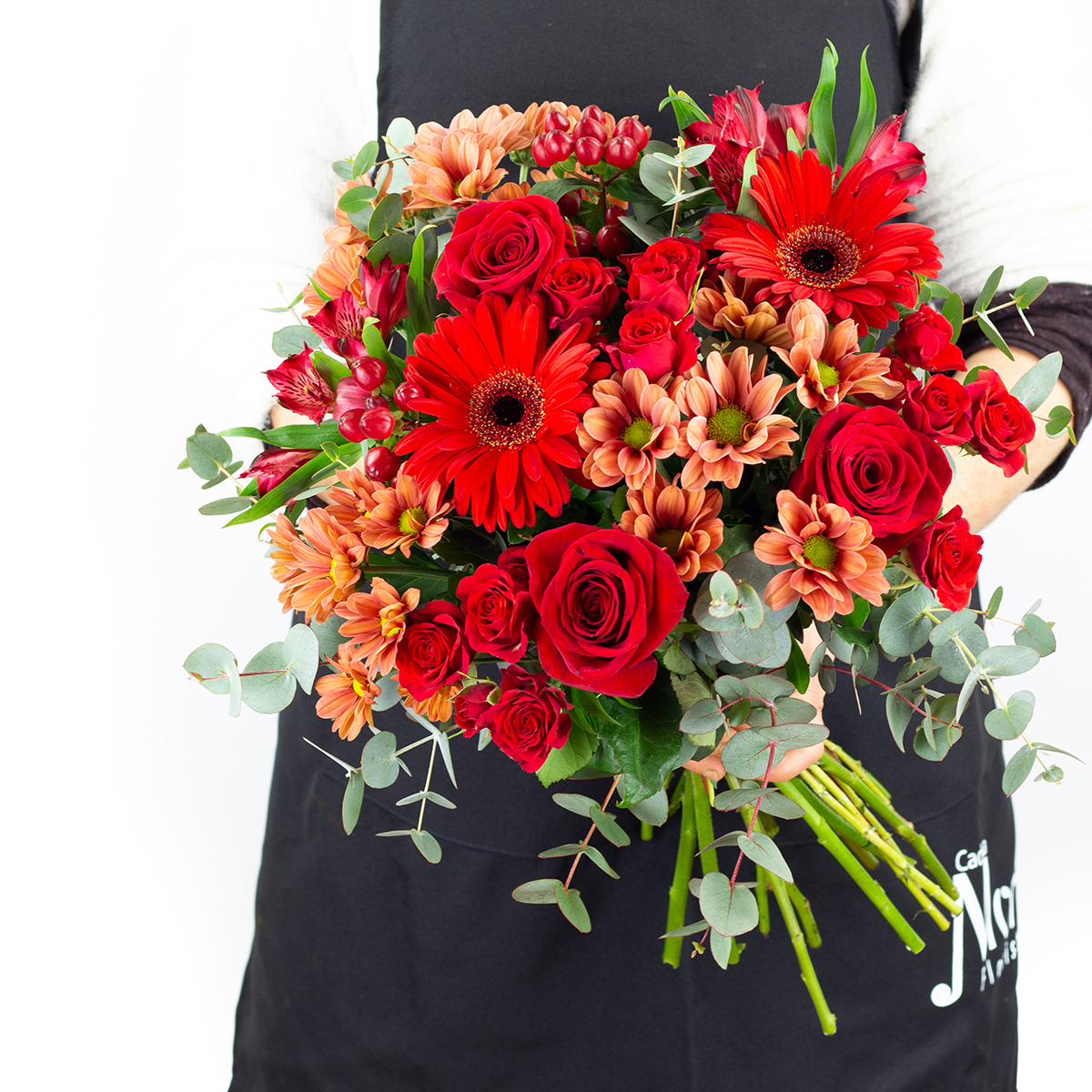 Ramo de flores frescas recién cortadas compuesto con rosas, rosas pitiminí, gerberas, astromelias, margaritas, hipericum y verdes variados.