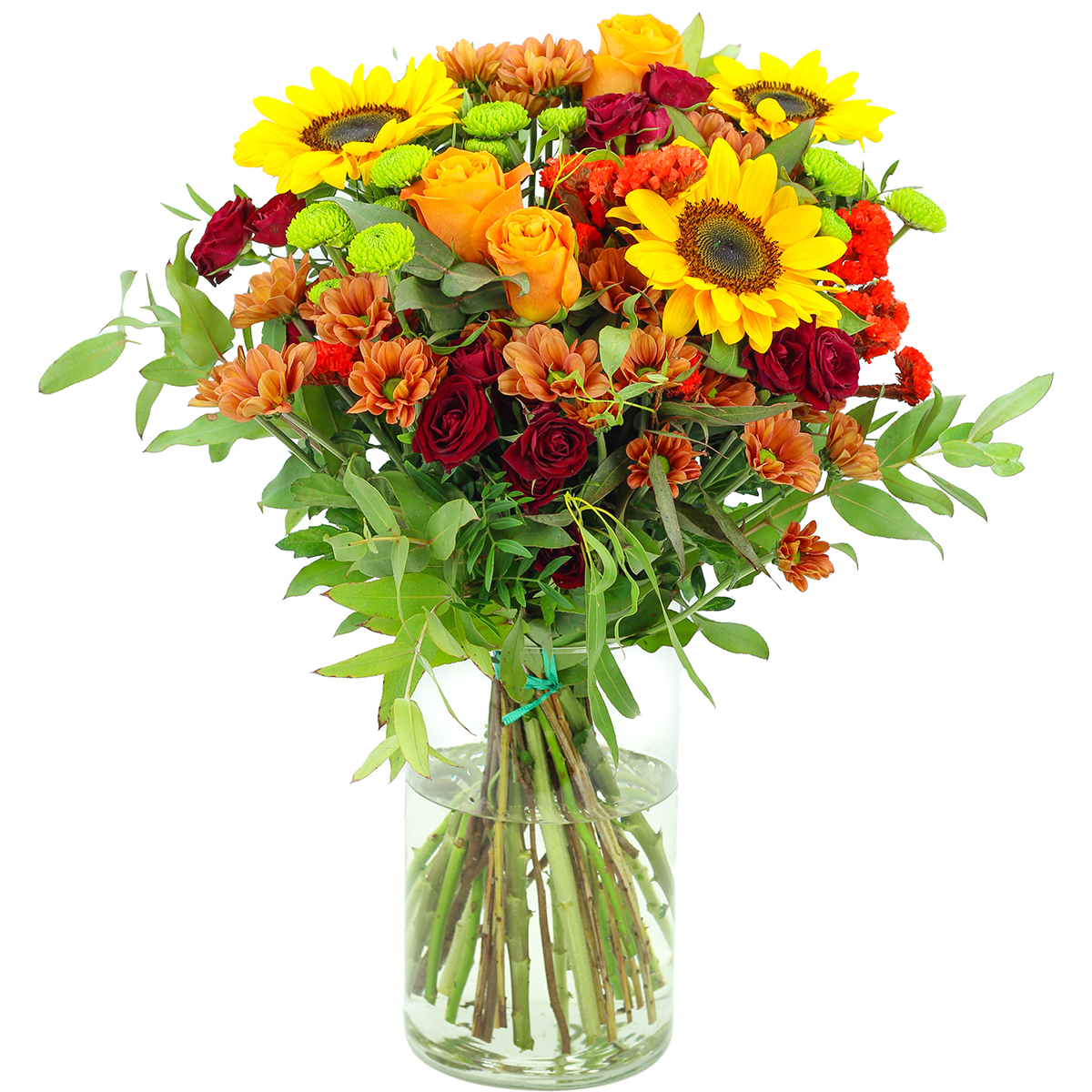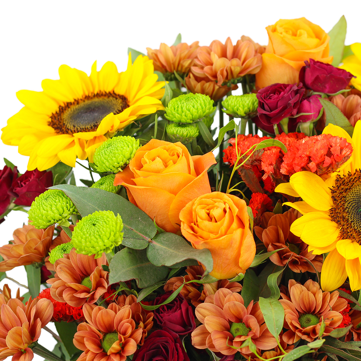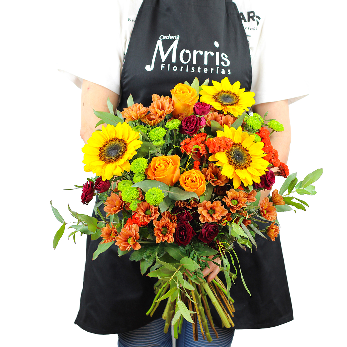 Ramo de flores frescas recién cortadas compuesto con rosas, girasoles, rosas de pitimini, margaritas y estatis.