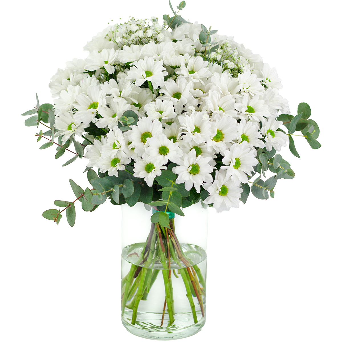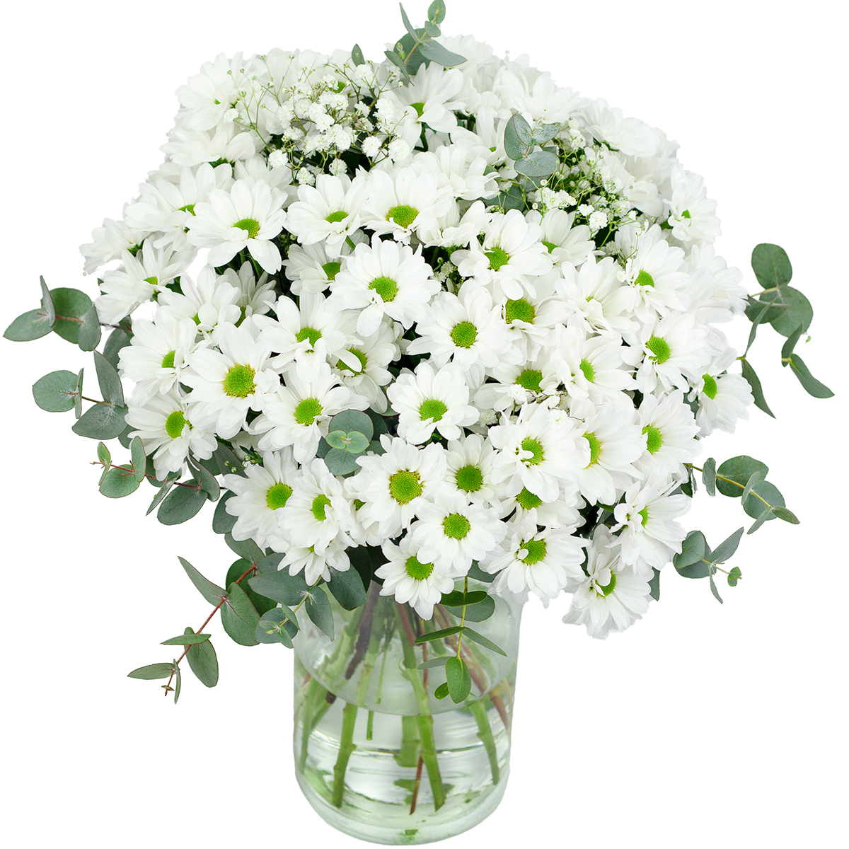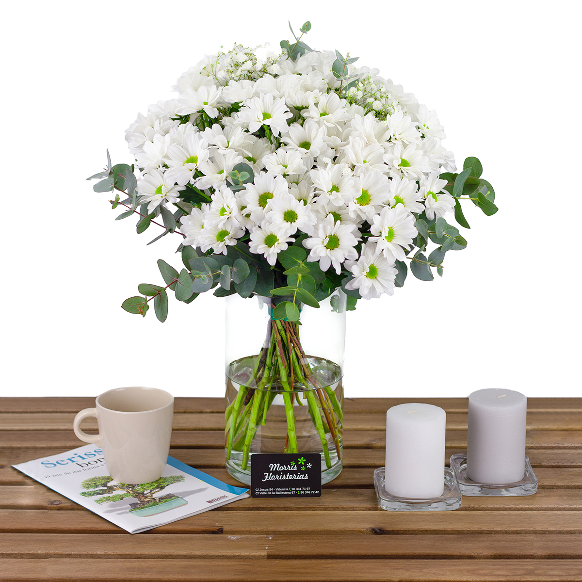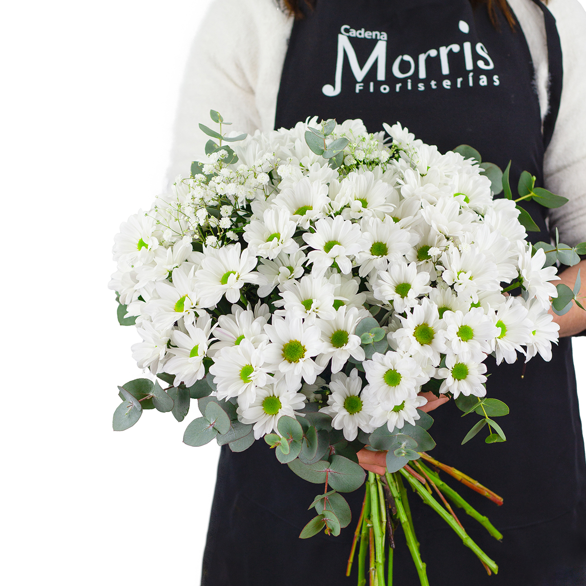 Las margaritas blancas son un clásico que nunca falla, un arreglo floral alegre que desprende pureza e inocencia. El ramo de margaritas simbolizan el comienzo de algo nuevo. Este ramo es adecuado para los motivos de su significado o simplente por su propia belleza que llenara de vida el hogar de ese ser querido.