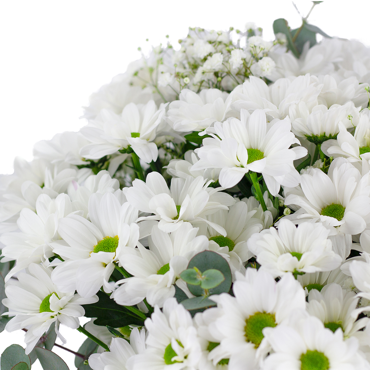 Ramo de margaritas blancas frescas recién cortadas con un toque de paniculata y verdes variados.