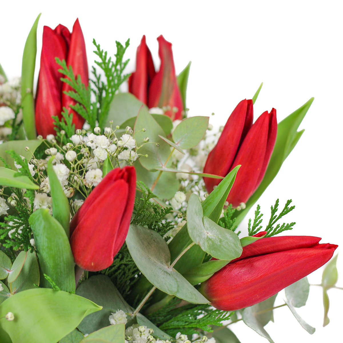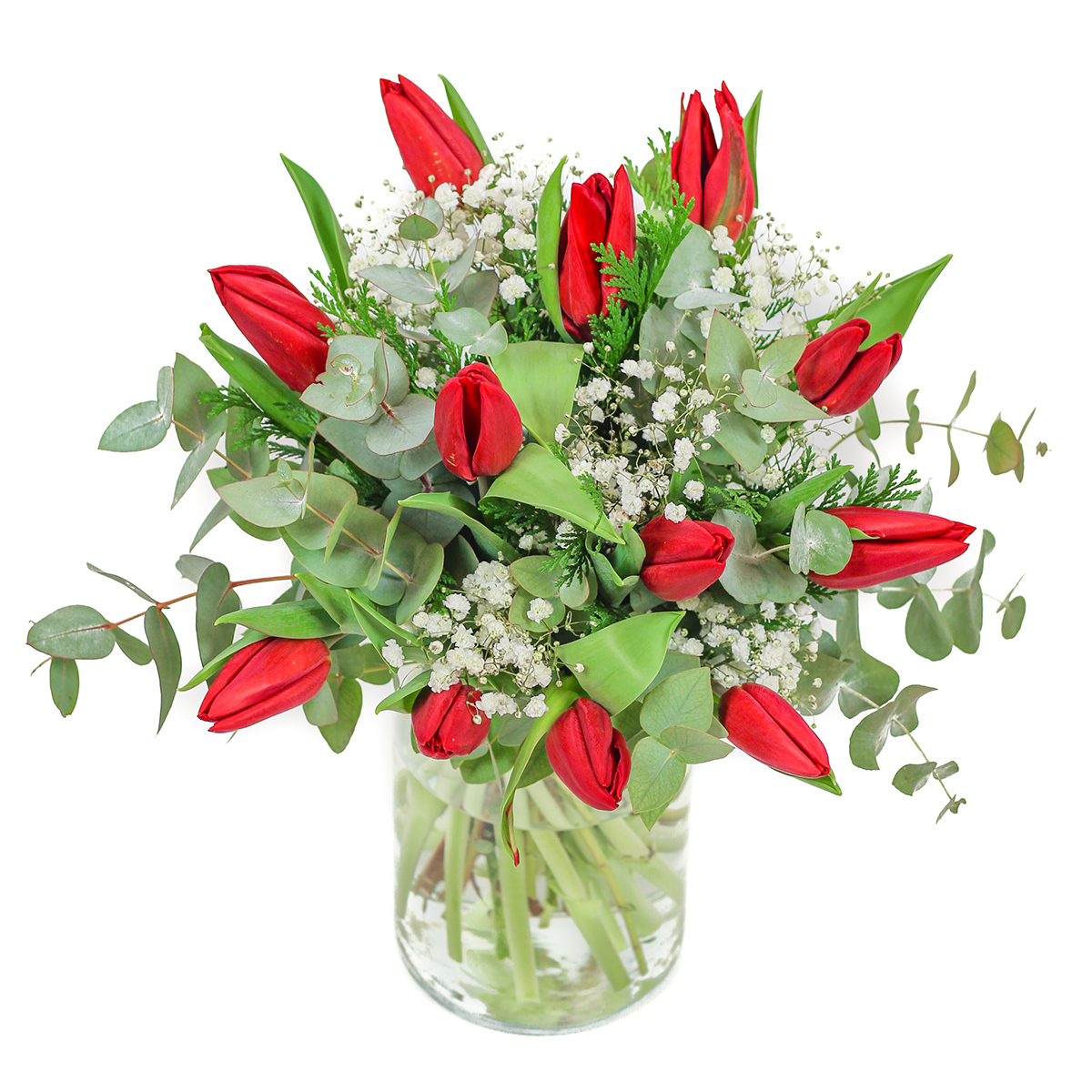 Ramo de tulipanes rojos frescos recién cortados con paniculata y verdes variados.