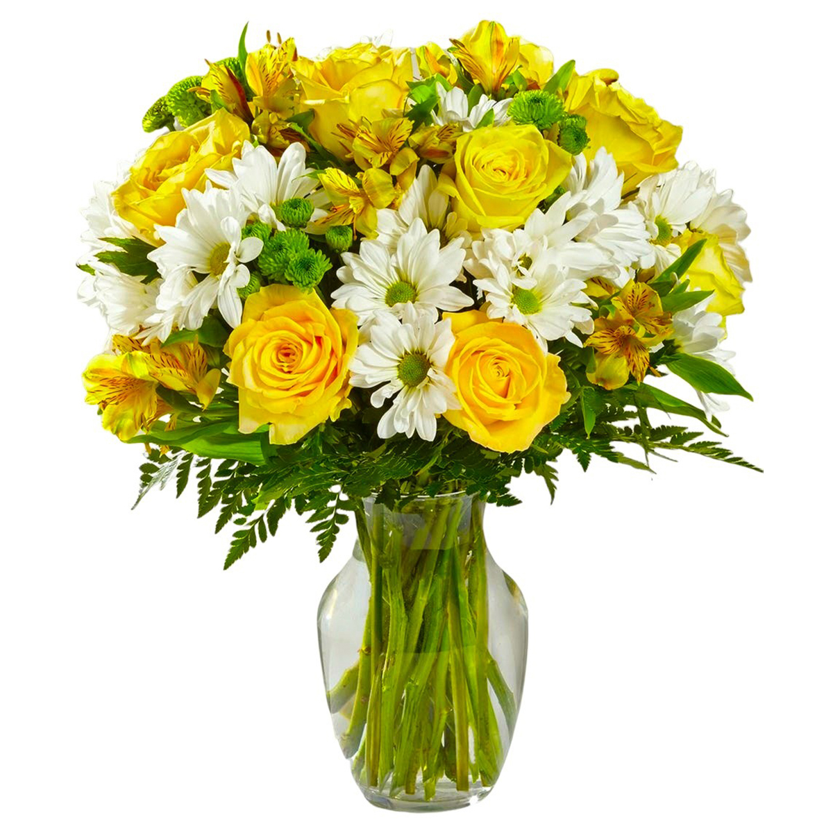 Ramo de flores variadas frescas recién cortadas compuesto con rosas, astromelias, y margaritas con un surtido de verdes variados.