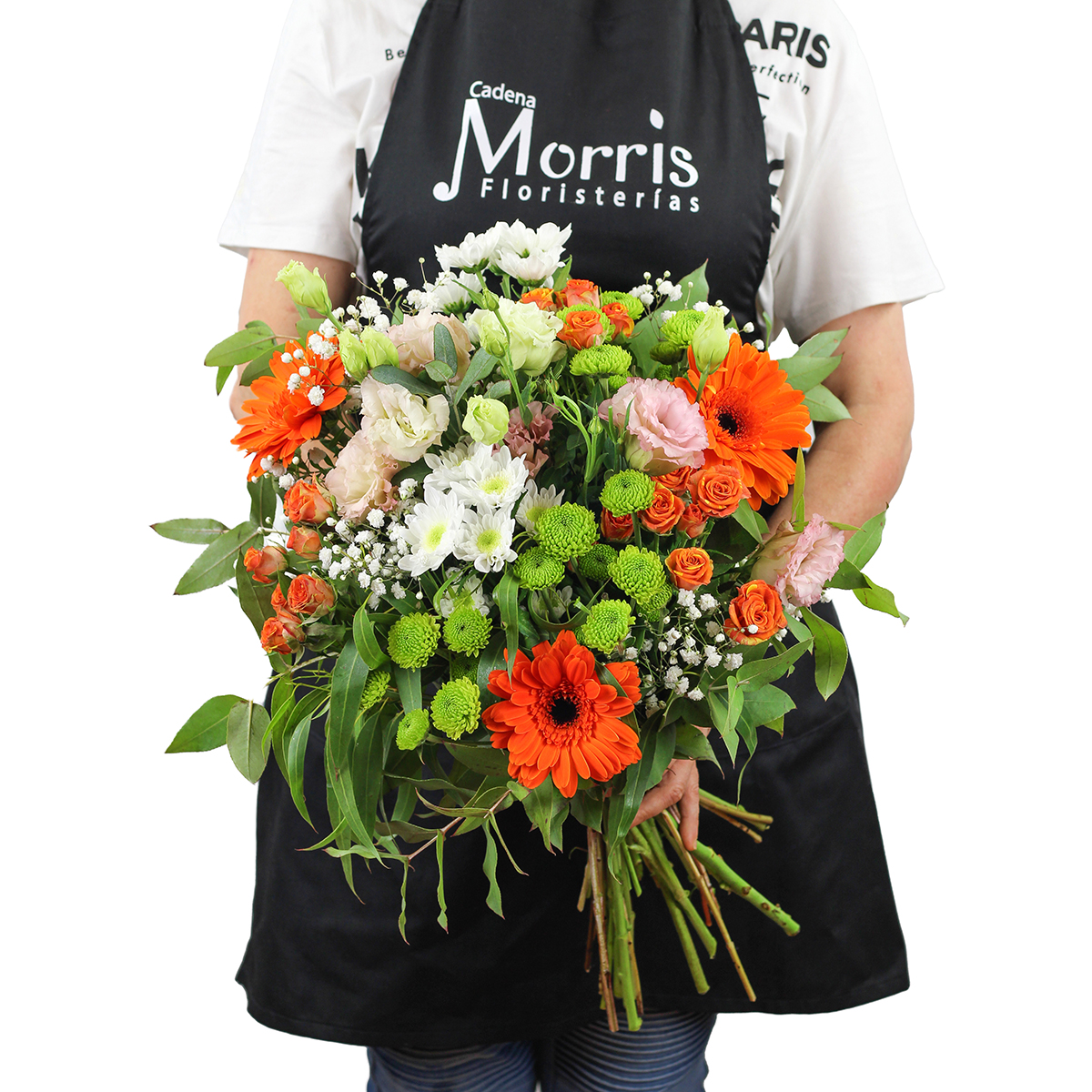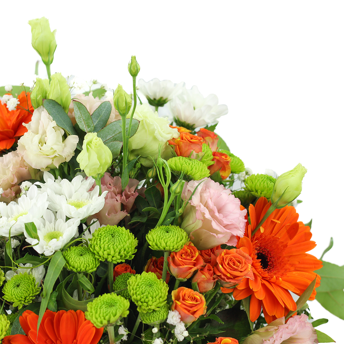 Ramo de flores frescas recién cortadas compuesto con rosas de pitimini, gerberas, lithiantus, margaritas paniculata y un surtido de verdes variados.