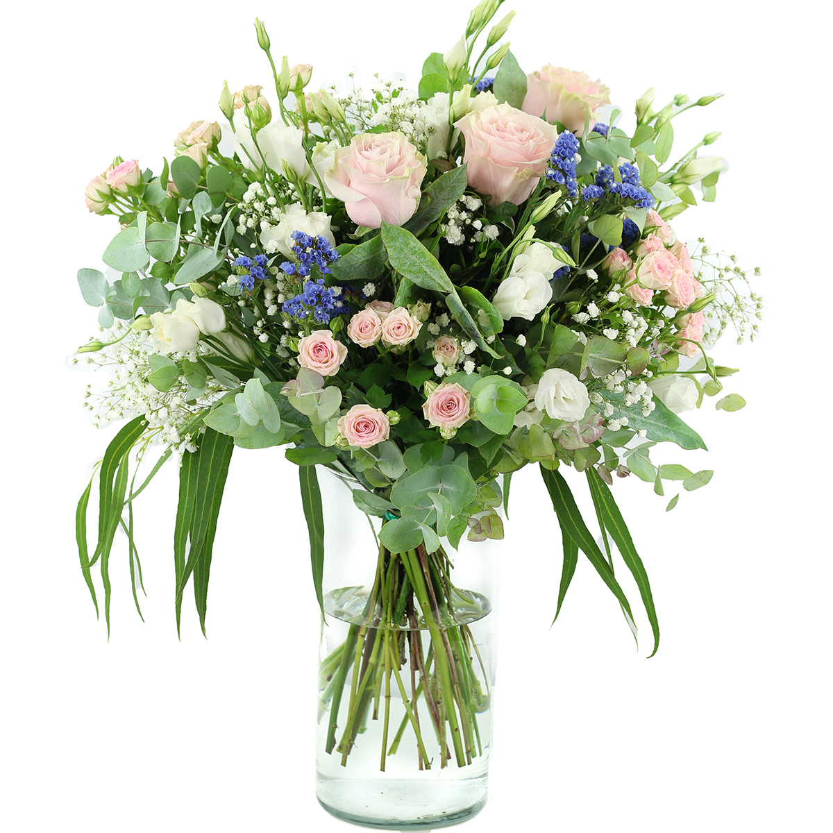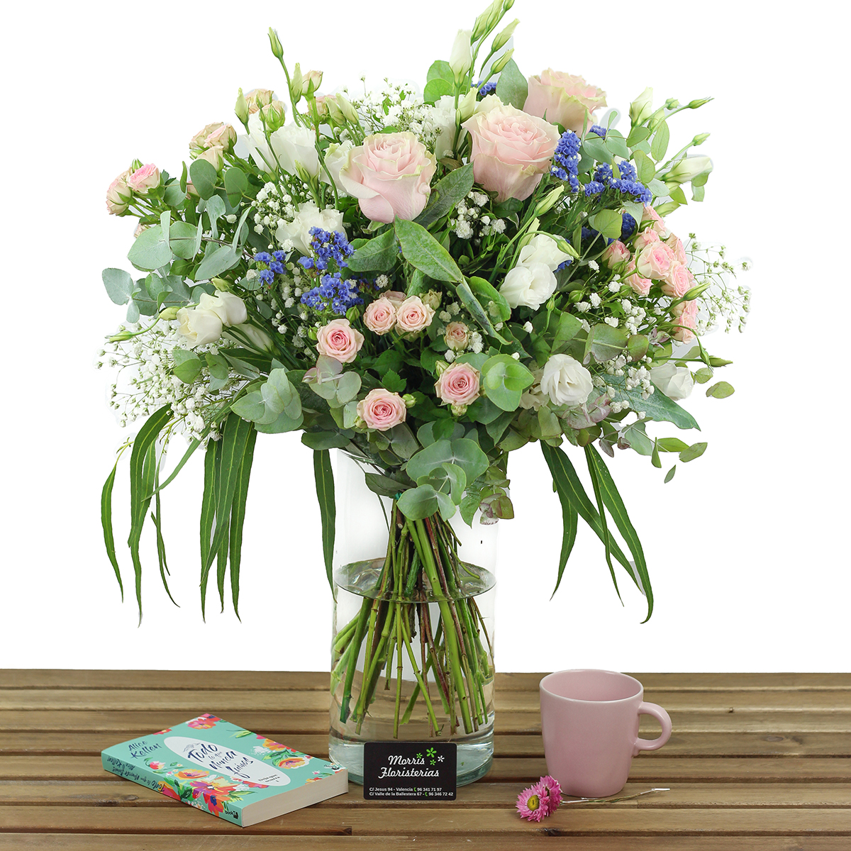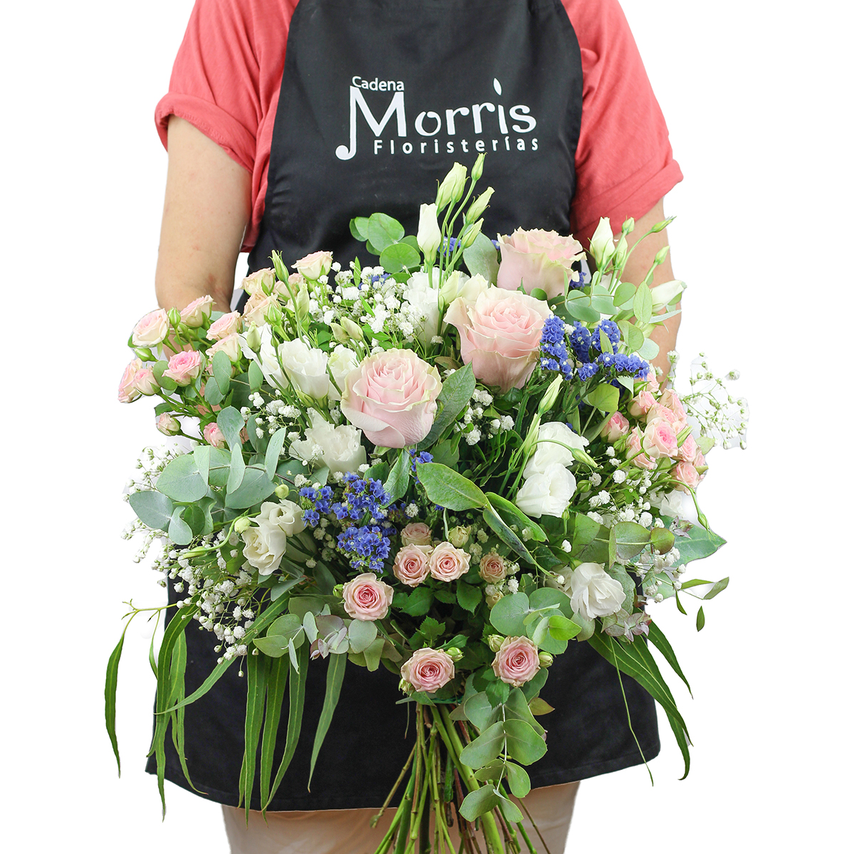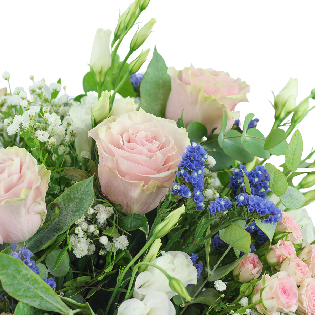Ramo de flores frescas recién cortadas compuesto con rosas, lithiantus, rosas de pitimini, estatis, paniculata y un surtido de verdes variados.