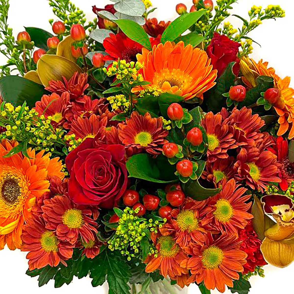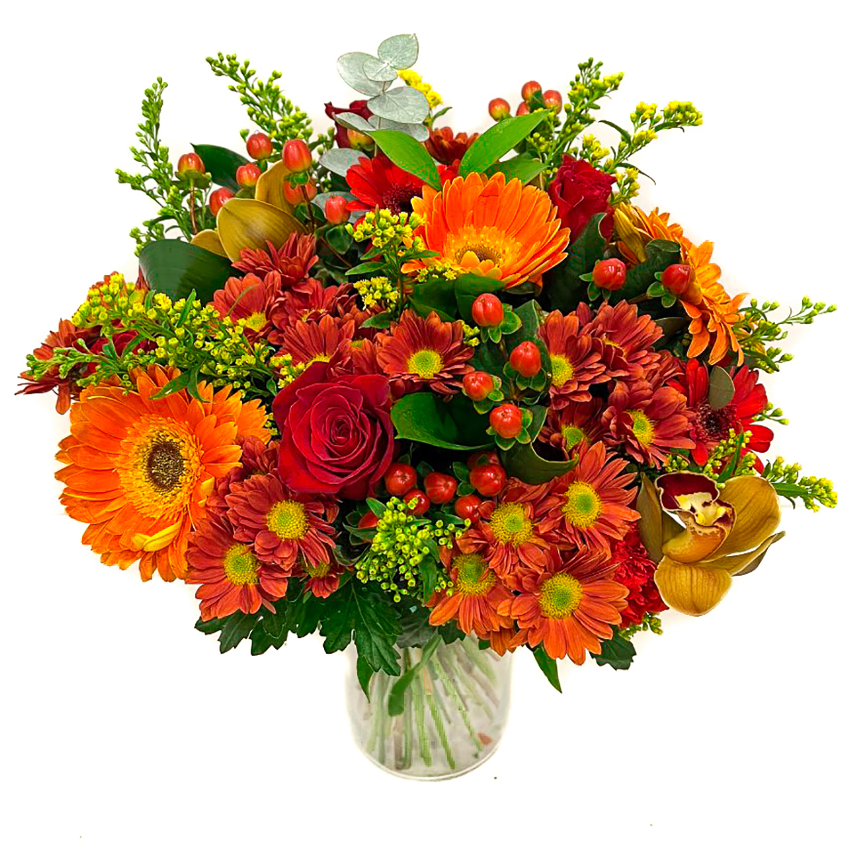 Este ramo de flores vibrantes es una auténtica joya visual que captura la esencia del otoño con calidez, elegancia y personalidad. Está compuesto por una exquisita mezcla de gerberas naranjas en diferentes tonalidades y tamaños, rosas rojas y orquídeas amarillas, entre otras flores, lo que lo convierte en un ramo colorido que evoca emociones intensas y transmite un mensaje de cariño profundo, pasión y alegría. Además, el contraste entre los tonos cálidos —naranjas, rojos y amarillos— y los verdes intensos del follaje genera una armonía cromática que resulta reconfortante y alegre. Las gerberas aportan vitalidad, las rosas simbolizan amor y admiración y las orquídeas, con su delicadeza exótica, dan el toque de distinción. Además, los pequeños frutos rojos decorativos y las ramas de eucalipto aportan textura, volumen y un aroma fresco que convierte este ramo en una experiencia multisensorial.