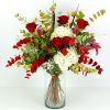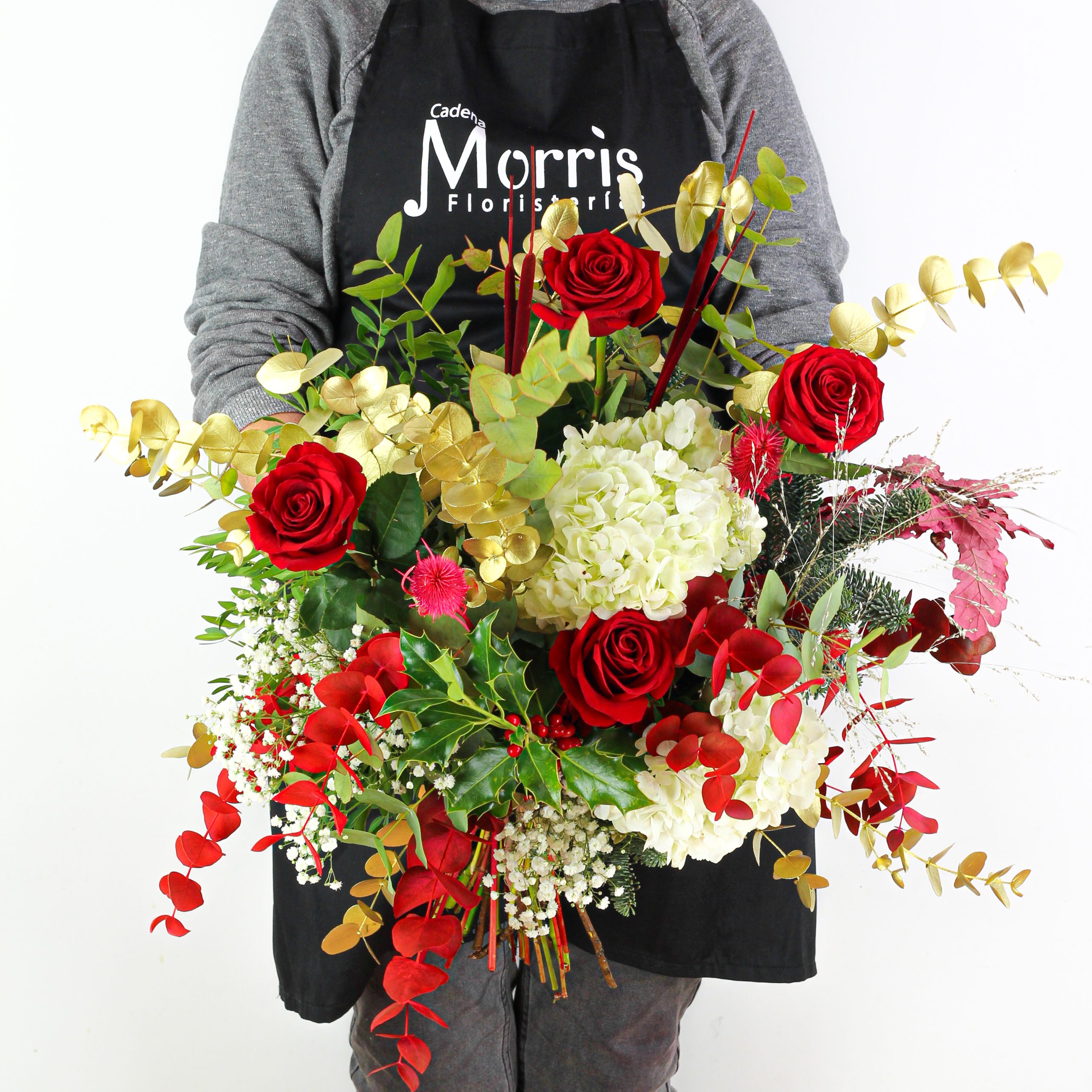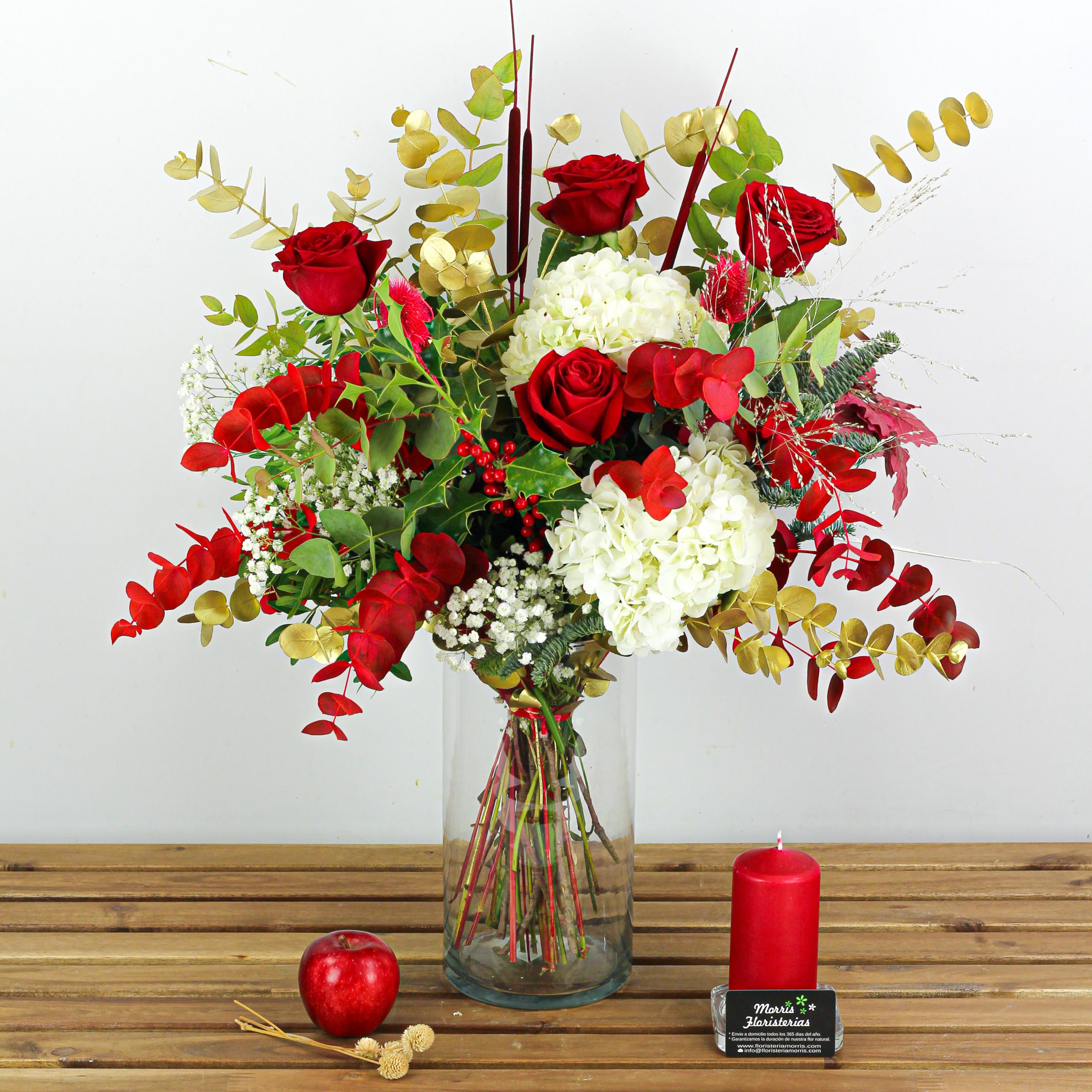 Ramo de navidad con flores frescas compuesto con rosas rojas, hortensias, paniculata, eucalipto, lentisco, nobilis, un toque de acebo y roble. Algunas de las flores de las imágenes son de temporada. Estos pueden variar ligeramente a los de la imagen dependiendo de su temporada y disponibilidad, siempre sustituyéndose por otras flores similares en estilo y valor.