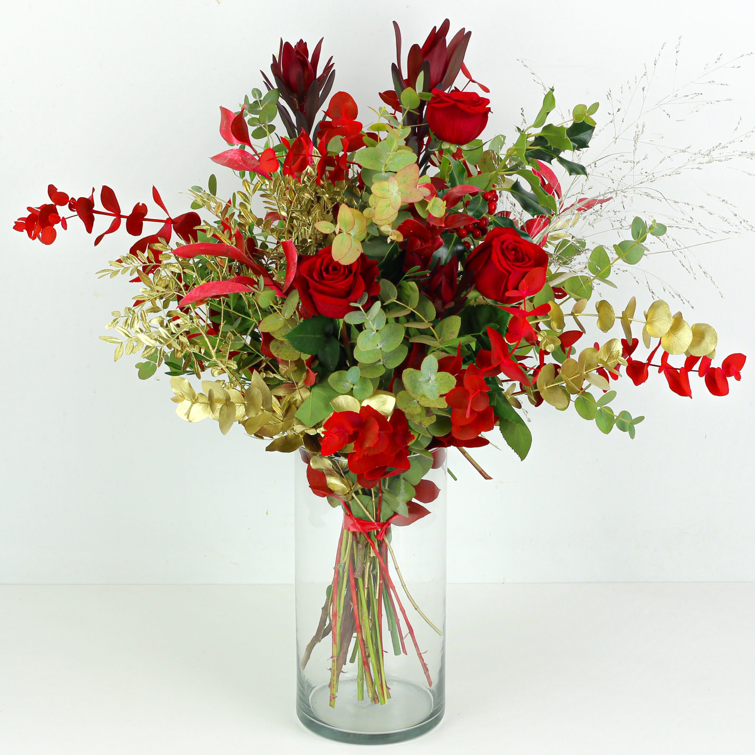 leucodendron, ruscus y un toque de acebo. Algunas de las flores de las imágenes son de temporada. Estos pueden variar ligeramente a los de la imagen dependiendo de su temporada y disponibilidad, siempre sustituyéndose por otras flores similares en estilo y valor.