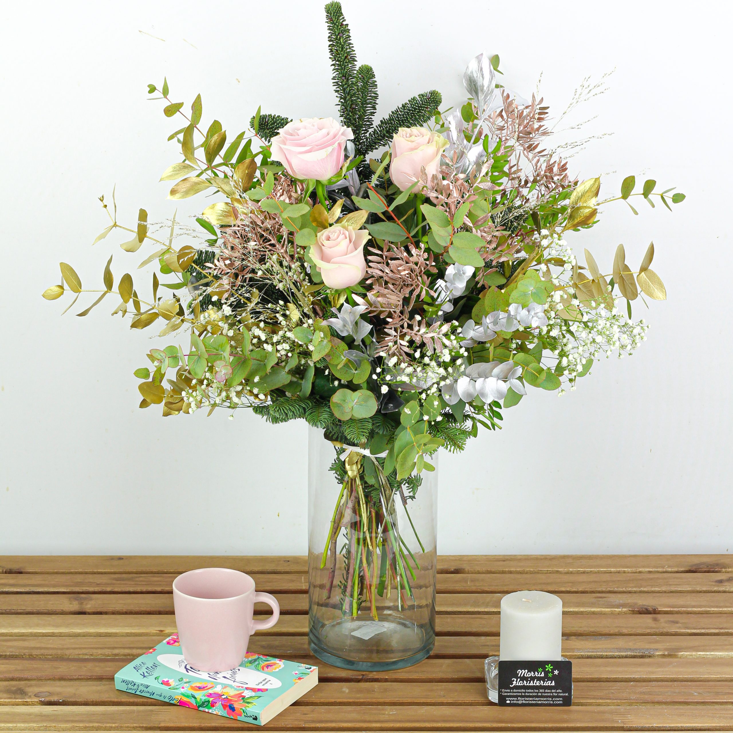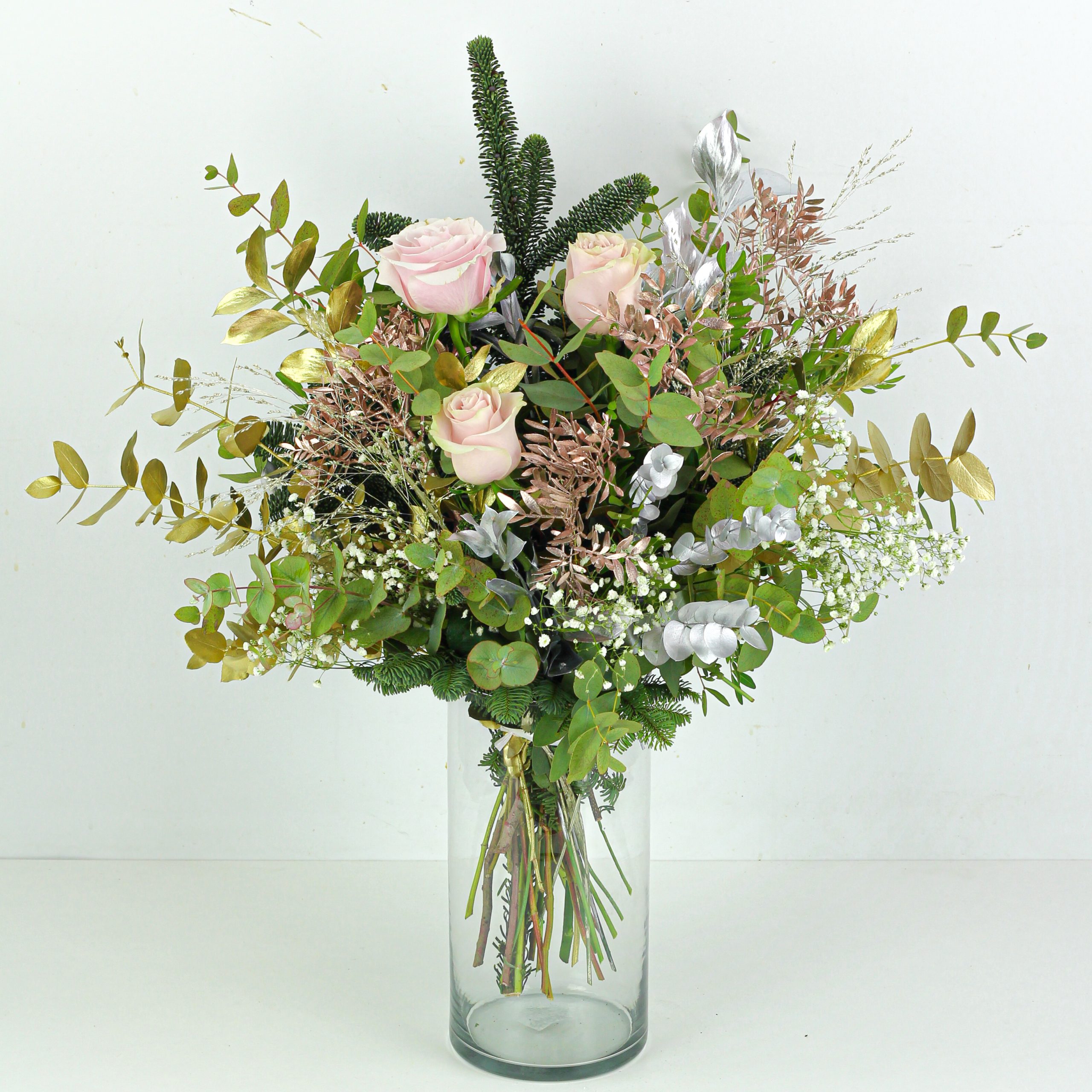Ramo de navidad con flores frescas compuesto con rosas rosadas, paniculata, eucalipto, lentisco, nobilis, y ruscus. Algunas de las flores de las imágenes son de temporada. Estos pueden variar ligeramente a los de la imagen dependiendo de su temporada y disponibilidad, siempre sustituyéndose por otras flores similares en estilo y valor.