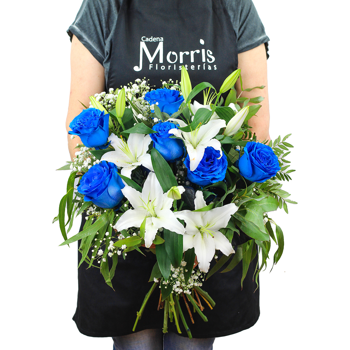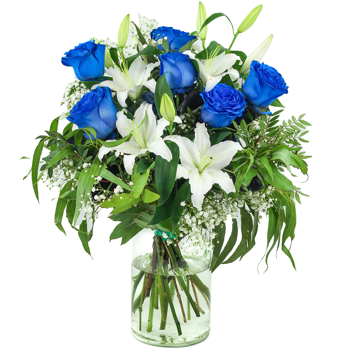 Ramo de flores frescas recién cortadas compuesto con rosas azules de tallo largo, lilium blanco, paniculata y un surtido de verdes variados.