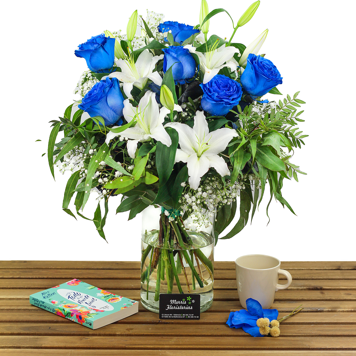 | Tallos | 4 rosas azules + 2 lilium blanco, 6 rosas azules + 3 lilium blanco (imagen), 12 rosas azules + 4 lilium blanco, 18 rosas azules + 4 lilium blanco |