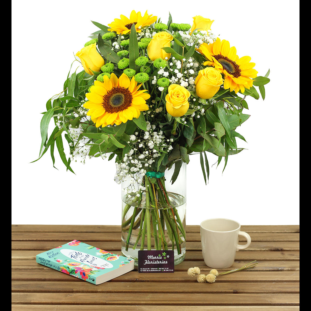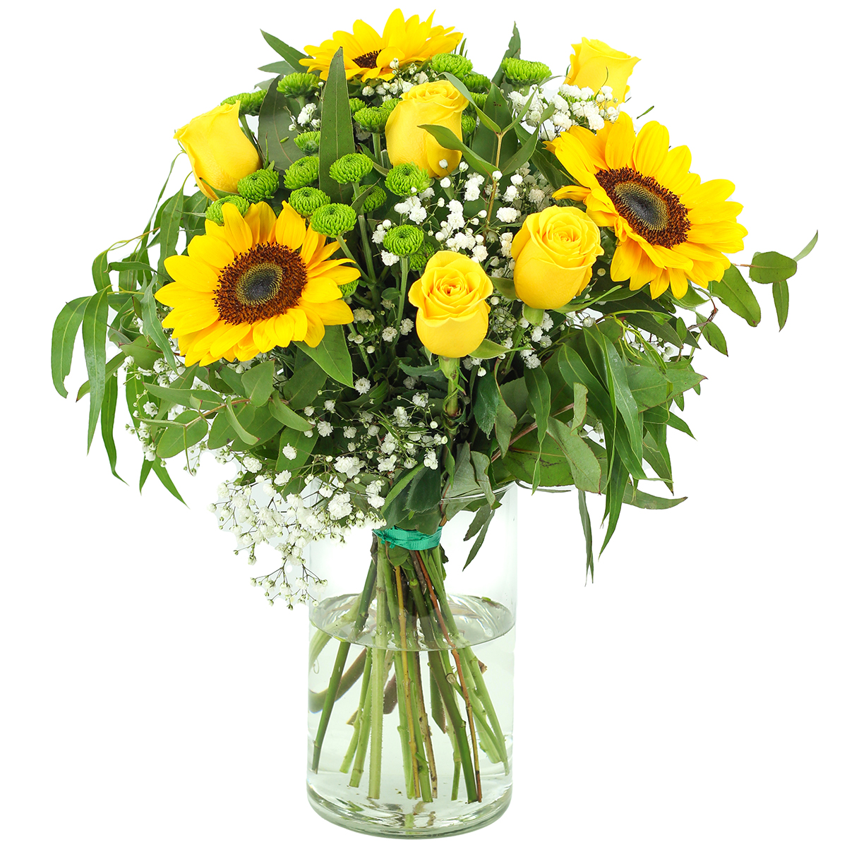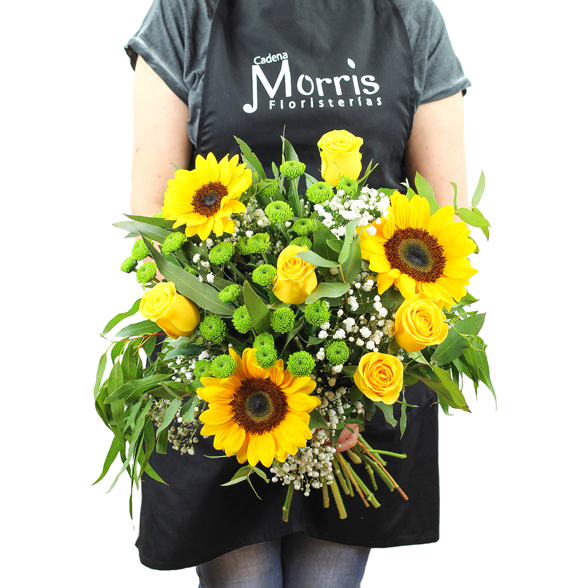 Ramo de flores frescas recién cortadas compuesto con rosas, girasoles, margaritas, paniculata y un surtido de verdes variados.