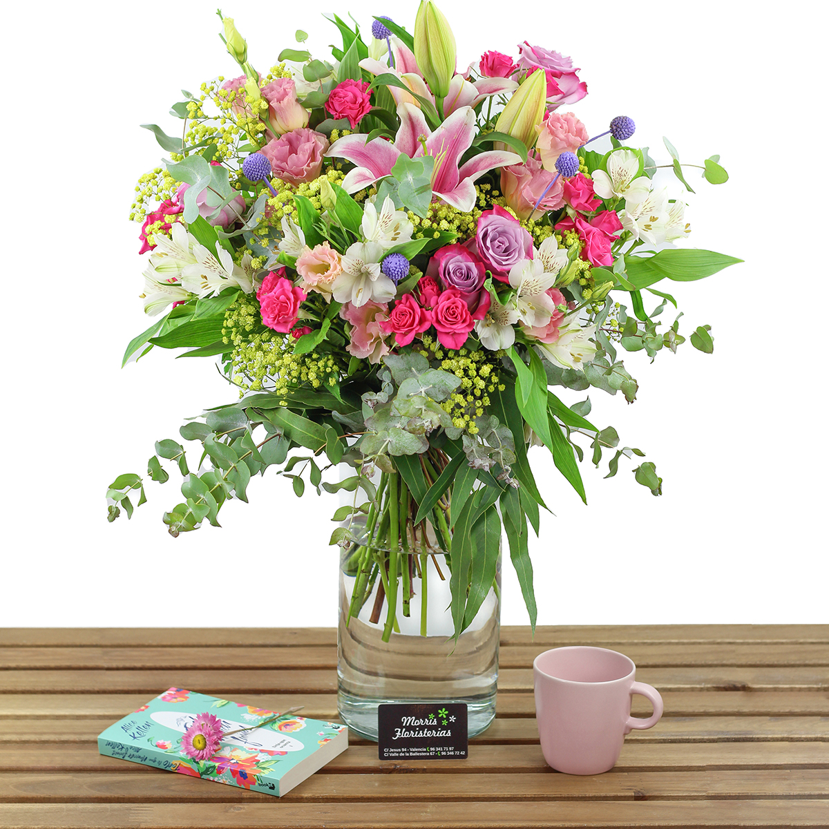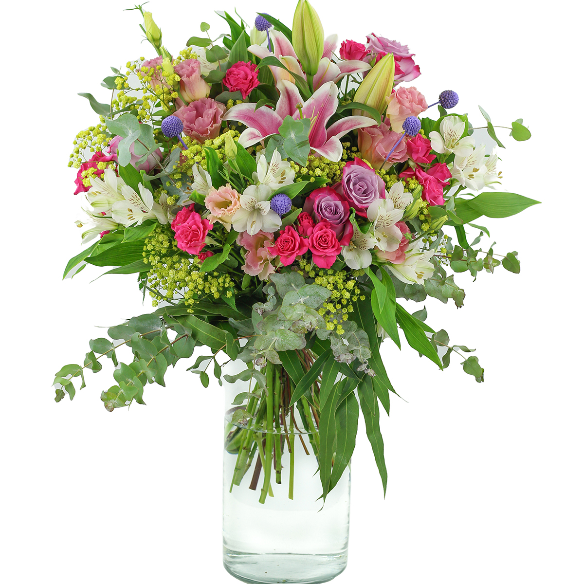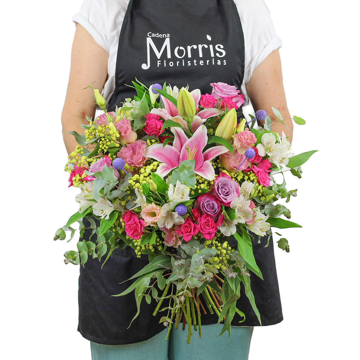 Ramo de flores frescas recien cortadas compuesto con lilium, rosas, lithiantus, rosas de pitimini, astromelias, paniculata y un surtido de verdes variados. (Las imágenes son orientativas, las flores y los colores pueden variar de aquellos que aparecen en la imagen según su temporada o disponibilidad. Nuestros floristas profesionales pueden sustituirlos por otra alternativa similar en estilo, calidad y valor.)