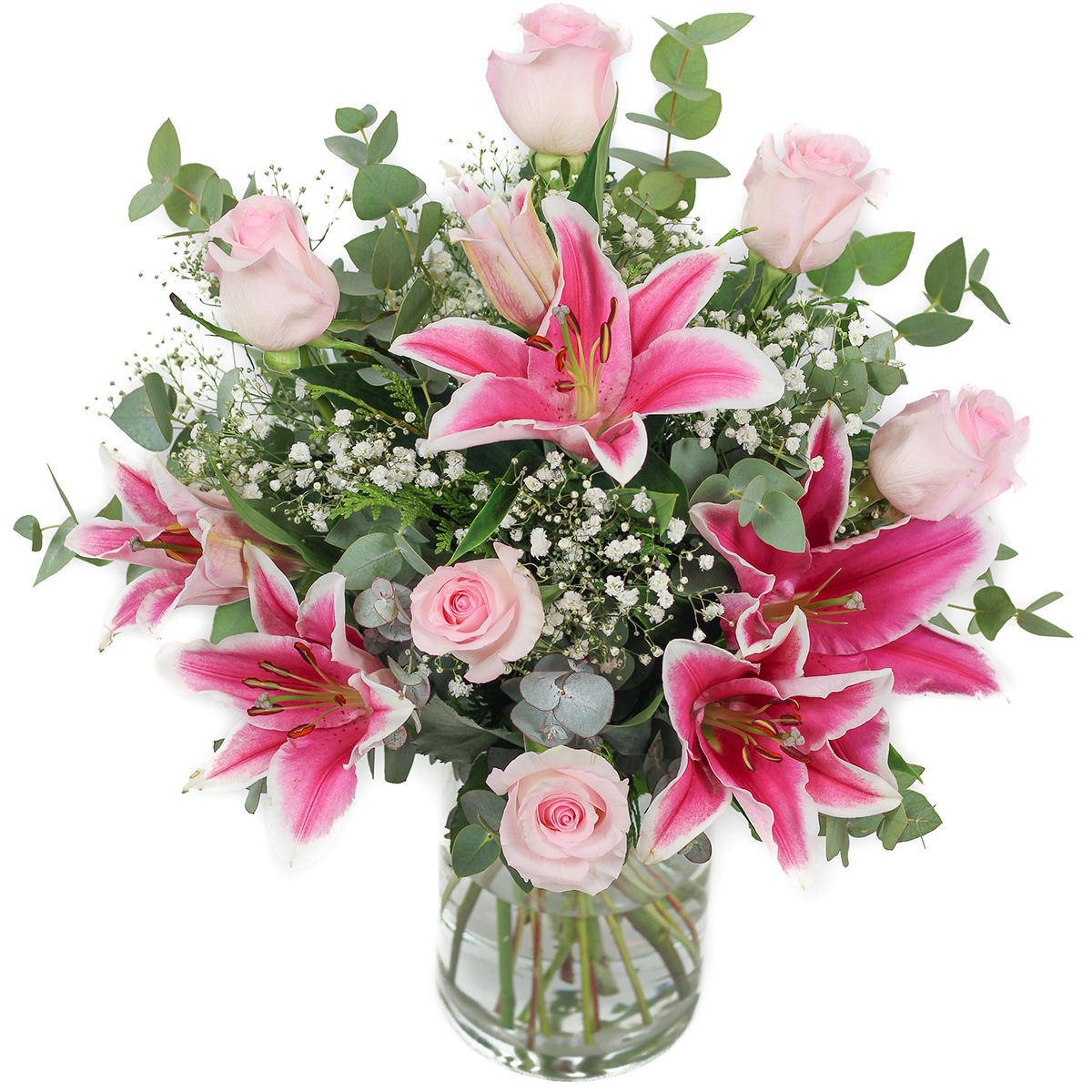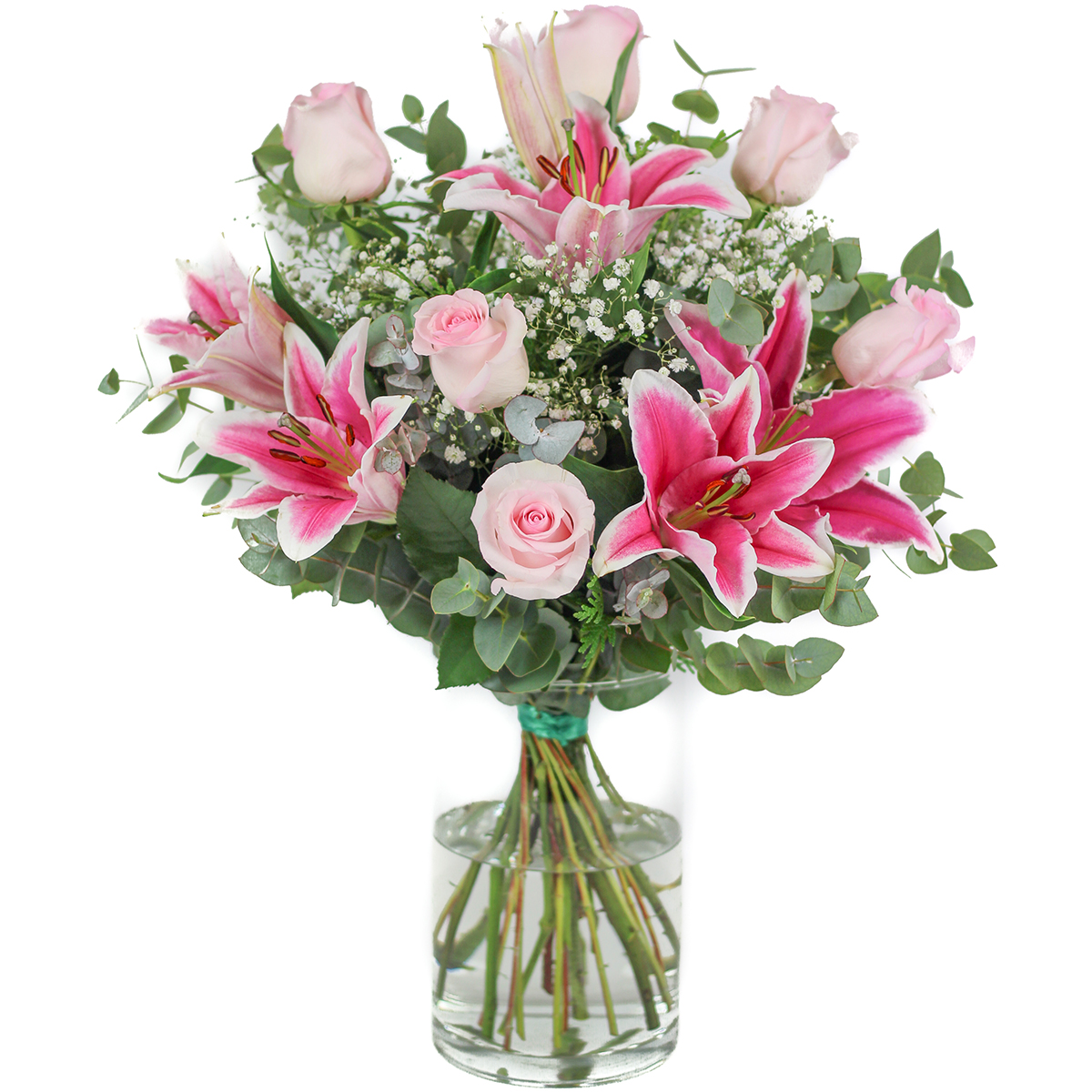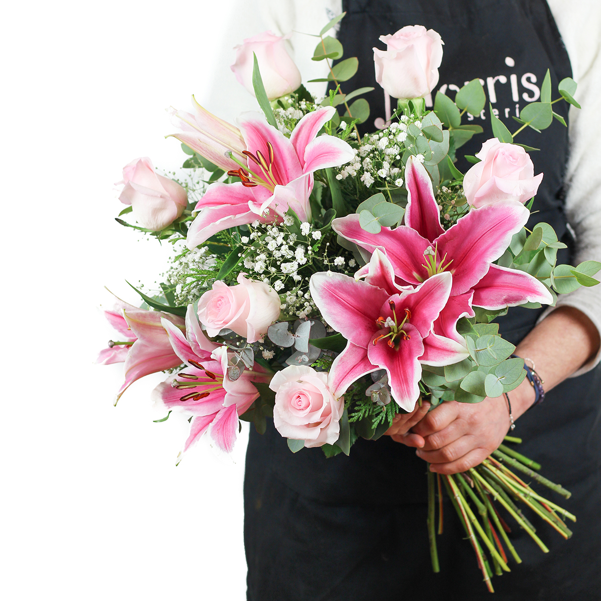 Ramo compuesto por rosas rosadas de tallo largo, lilium oriental fucsia, gypsophila y un bonito surtido de verdes variados.
