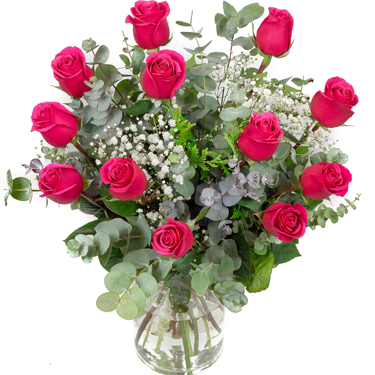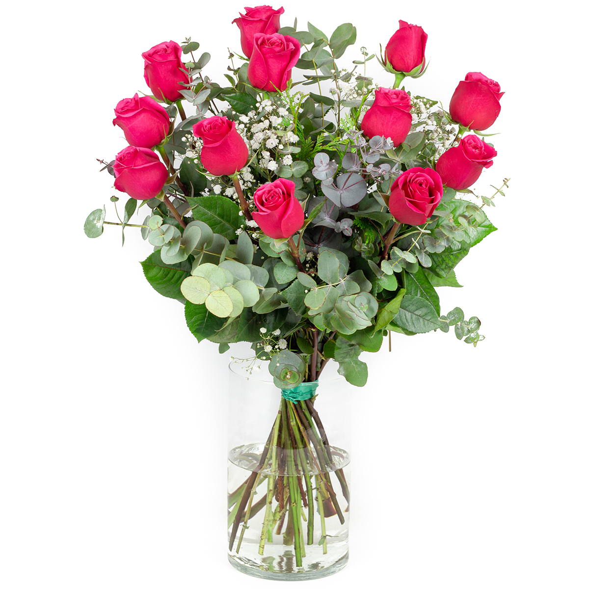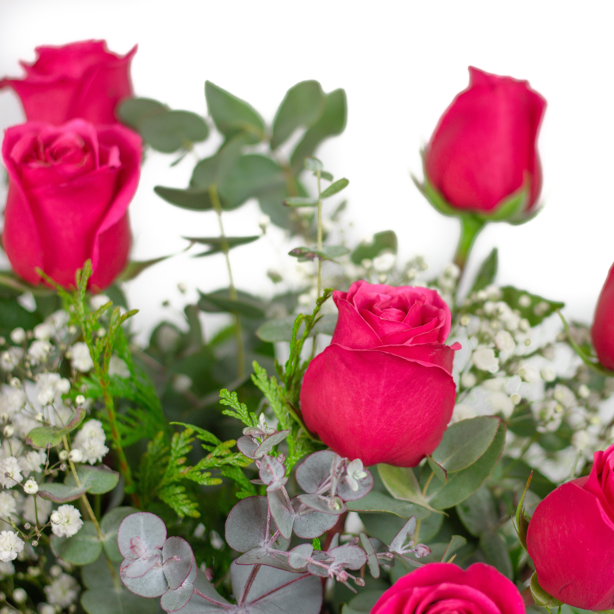 Este precioso ramo de rosas fucsias es una expresión de elegancia y vitalidad que no pasa desapercibida. Las vibrantes rosas de un intenso color fucsia destacan por su belleza y simbolizan sentimientos de admiración, frescura y los primeros momentos de novedad e inocencia al conocer a alguien especial. Su diseño sofisticado y equilibrado lo convierte en el detalle perfecto para ocasiones como un primer encuentro, un aniversario o simplemente para alegrar el día de alguien querido. Cada rosa fucsia se complementa con un follaje cuidadosamente seleccionado que incluye hojas de eucalipto y delicadas flores de relleno, creando una composición fresca y armoniosa que resalta aún más el protagonismo de las flores. Su combinación de colores y texturas logra un efecto visual encantador y moderno, ideal para llenar cualquier espacio de vida y alegría.