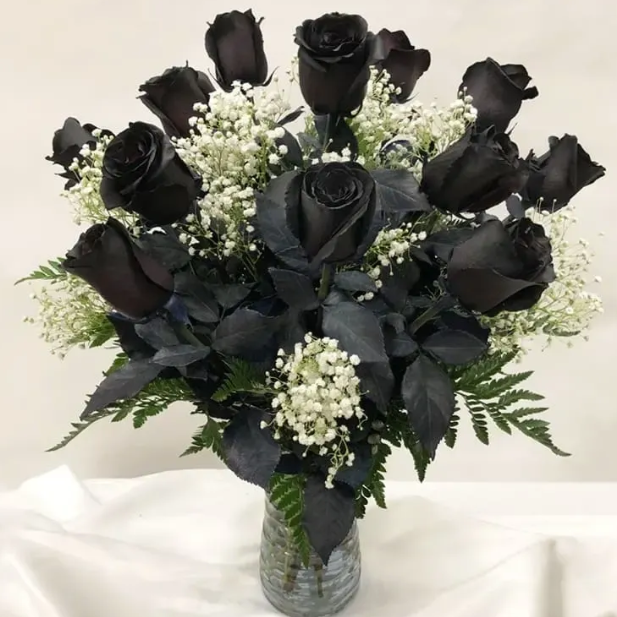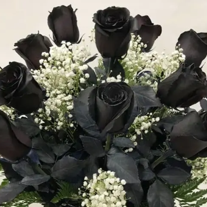 El arreglo floral está complementado con el follaje de hojas de las propias rosas negras, también teñidas. Además, se ha creado un contraste de tonos verdes con el negro de las flores que genera un efecto visual único y refuerza la temática monocromática del ramo. Entre las rosas y el follaje, por otro lado, se aprecia un delicado acompañamiento de flores blancas diminutas con paniculata o “nube” que añaden un toque de suavidad y equilibrio al diseño. Estas flores pequeñas y etéreas ofrecen un contraste brillante contra las rosas negras, aportando un matiz visual ligero y romántico.