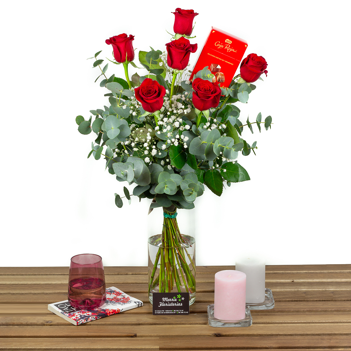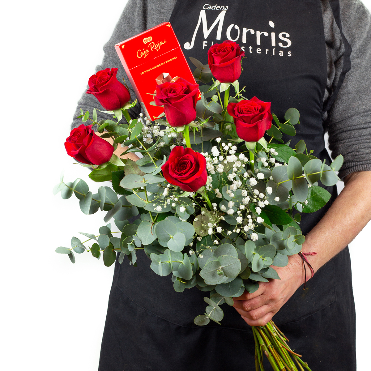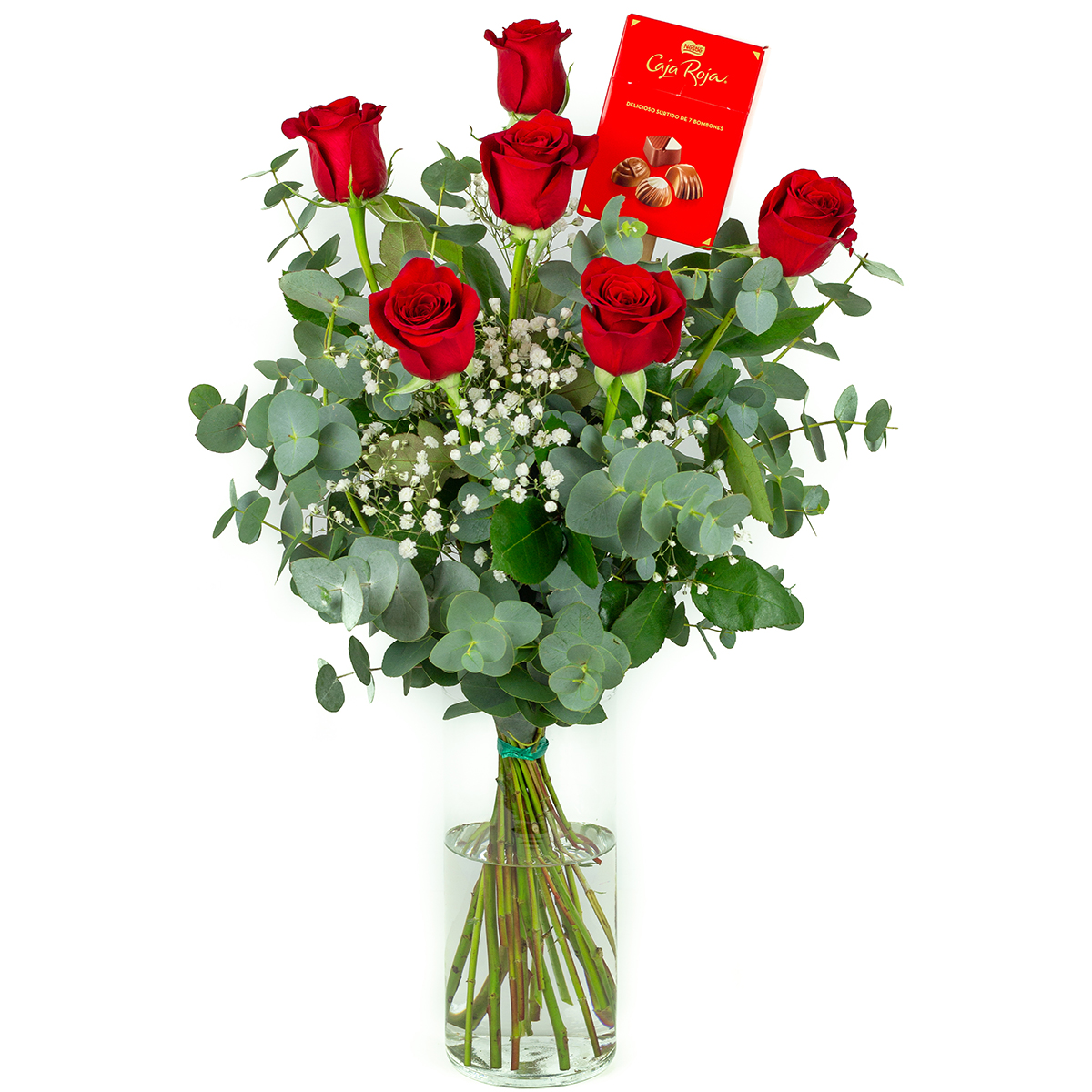 | Rosas + bombones | 6 rosas + bombones (imagen), 12 rosas + bombones, 18 rosas + bombones, 24 rosas + bombones |