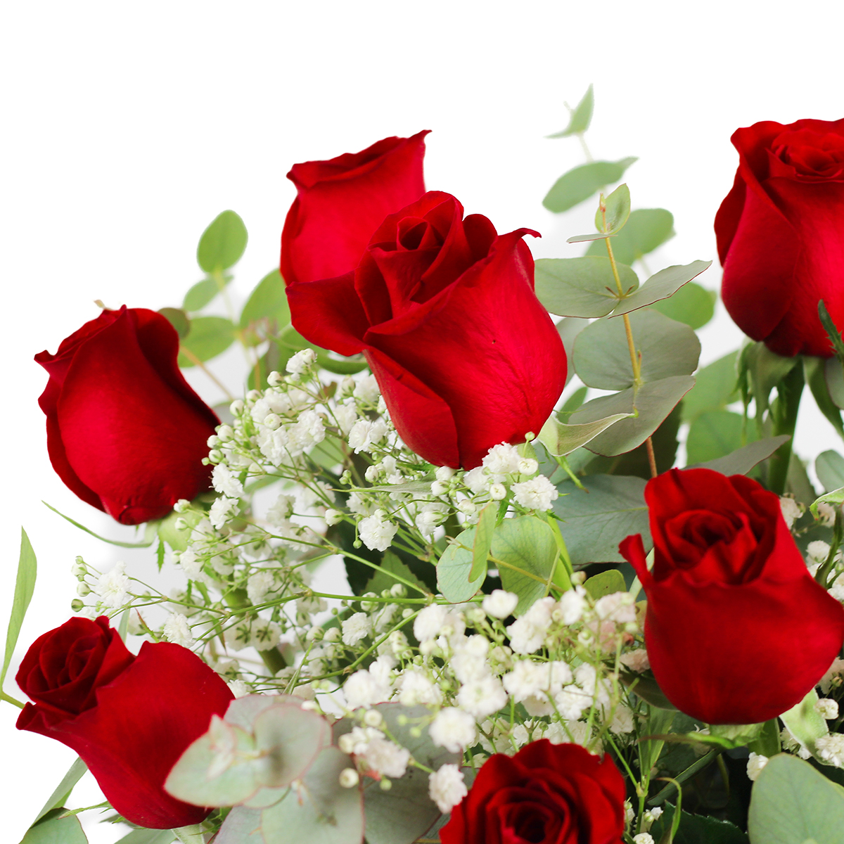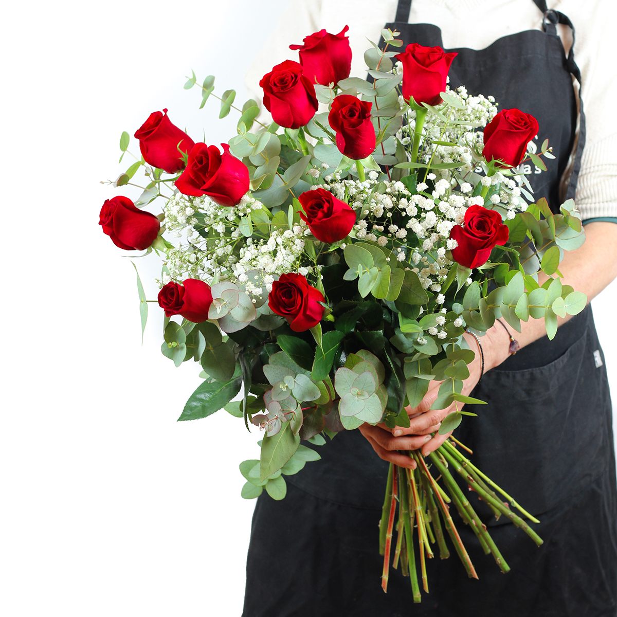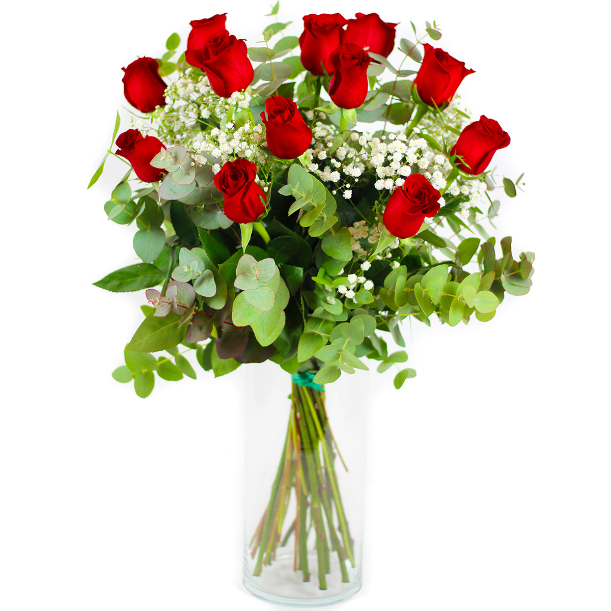 Este ramo de rosas rojas de tallo largo cuidadosamente arreglado se caracteriza por su belleza clásica y sofisticada, siendo un símbolo universal de amor, pasión y admiración. Nuestros ramos de rosas rojas espectaculares están compuestos por flores con intenso color, con pétalos perfectamente formados y cerrados que resaltan por su textura aterciopelada y el cuidado en cada detalle a la hora de prepararlo. Las rosas, distribuidas de manera uniforme, son las principales protagonistas del arreglo, junto a sus tallos largos y rectos, visibles a través del jarrón, que aportan un aspecto estilizado y refinado al conjunto. Además, complementando a las rosas, el ramo incluye ramas de gypsophila, también conocida como nube o velo de novia, cuyas pequeñas flores blancas añaden un contraste delicado y etéreo al color vibrante de las rosas. Este elemento proporciona ligereza al diseño y enmarca las rosas de manera armoniosa. Así mismo, el ramo está decorado con hojas verdes de eucalipto con forma redondeada y un tono verde suave que equilibra el arreglo, dando una sensación de serenidad y elegancia, y aportando un toque fresco y natural.