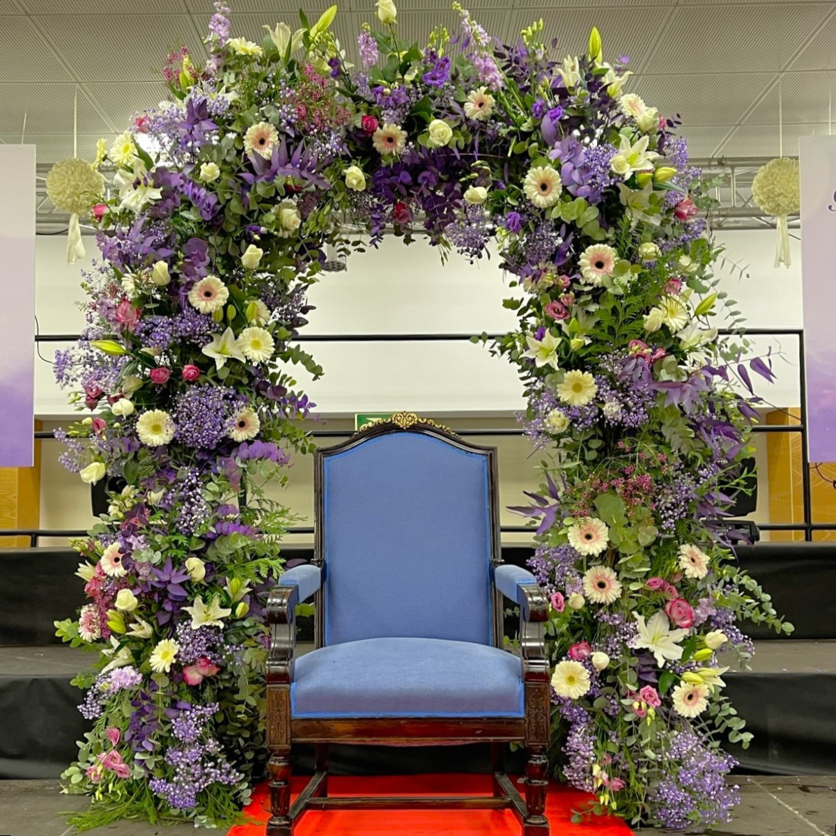 Arco de flores compuesto por verdes, eucalipto y una combinación de flores variadas en tonos blancos, fucsias y morados.