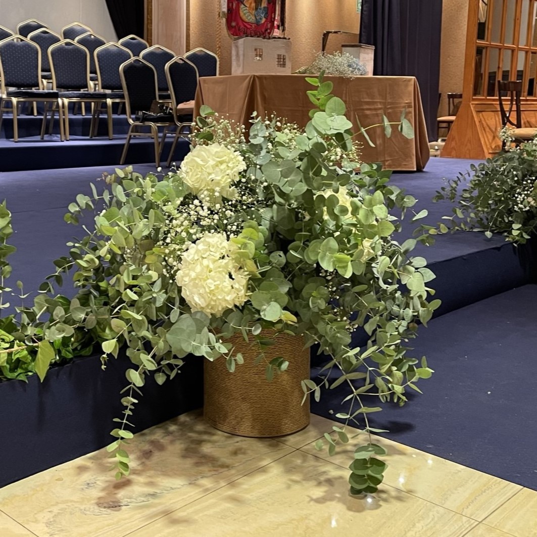 El capazo rustico es un arreglo floral compuesto con verdes variados, eucalipto, hortensias y paniculata sobre una base de mimbre. Este arreglo es ideal para decorar eventos y bodas ya que dará un toque de naturaleza y alegría para celebrar un día especial.
