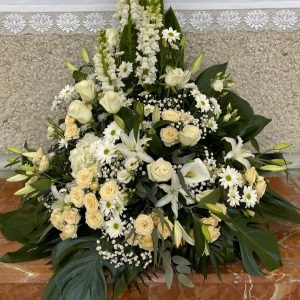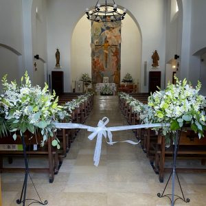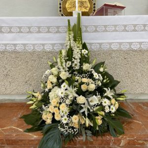 En Floristería Morris somos una floristería en Valencia barata con tiendas físicas y servicio de envío de flores a domicilio. Te ofrecemos los mejores precios en centros de flores naturales para iglesia, peanas, ramos para bancas y mucho más. Nos encargamos de la realización de arreglos con flores para bodas en iglesias, flores para comunión en iglesias, bautismos y otras celebraciones. Además, cuidamos al máximo el detalle de nuestros envíos para que la decoración de flores para iglesia sea estupenda y las flores conserven todas sus propiedades estéticas y aromáticas y duren el mayor tiempo posible. Nuestros centros de flores para bodas en iglesias y centros de flores para iglesia en formato de altar o peanas se componen de una gran variedad de especies diferentes. La mayoría de ellas en tonos blancos, ya que simbolizan pureza, paz y tranquilidad. Además, por supuesto, de los rematados con una gran variedad de tonalidades verdosas para crear contrastes únicos.