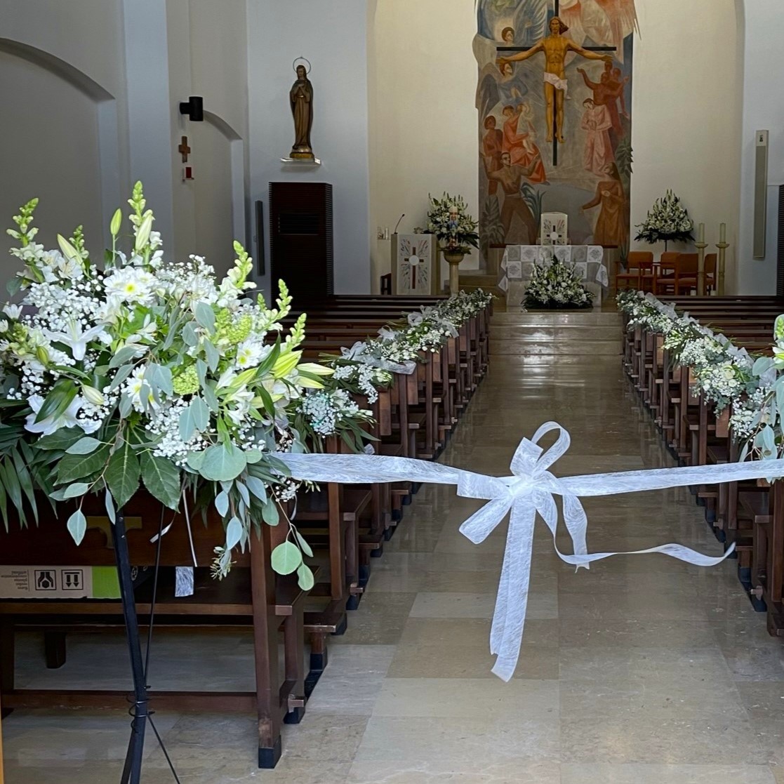 Este adorno consiste en dos centros redondos sobre una peana metálica negra. Las flores están compuestas con una variedad de flores con diferentes texturas en tonos blancos y verdes, finalmente están rematados con un surtido verdes. Las dos peanas van unidas con un lazo para celebrar y dar la bienvenida a los novios.