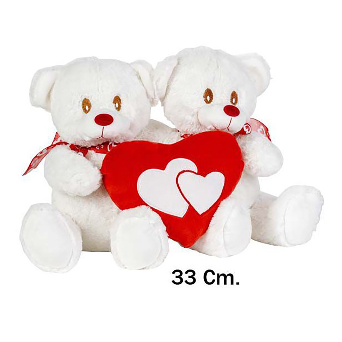 Pareja de ositos de peluche con un corazón en el medio de 33 cm.