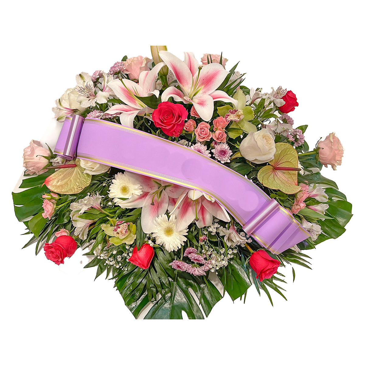El Almohadón blanco y rosado es un centro compuesto por flores variadas con una armonía de colores blancos y rosados y un surtido de verdes variados. El centro puede tener una anchura aproximada de 60cm a 110cm según la opción solicitada. Dependiendo de la disponibilidad y la temporada de la flor nuestros floristas profesionales pueden substituir flores por una alternativa conveniente, similar en estilo, calidad y valor.