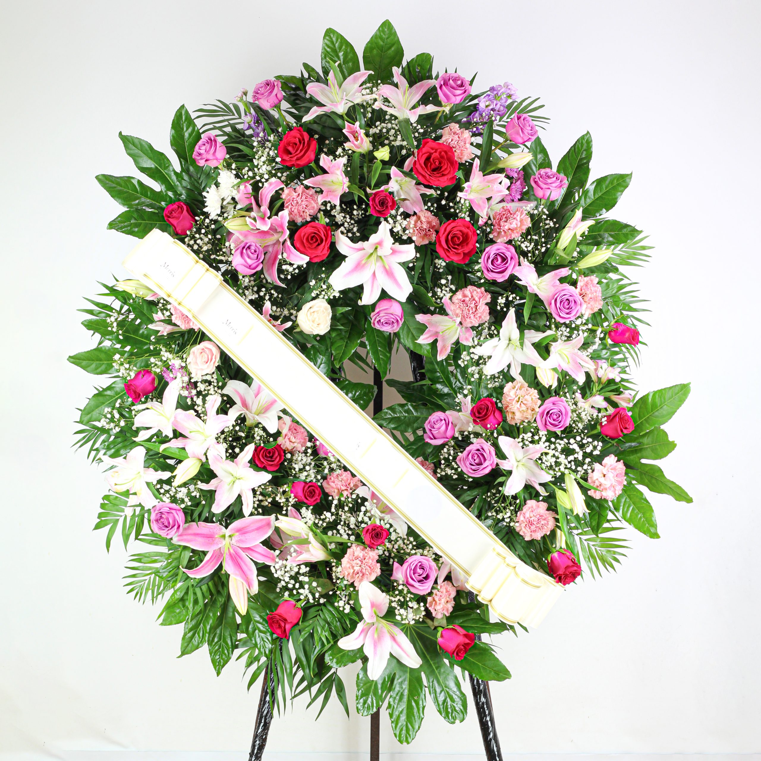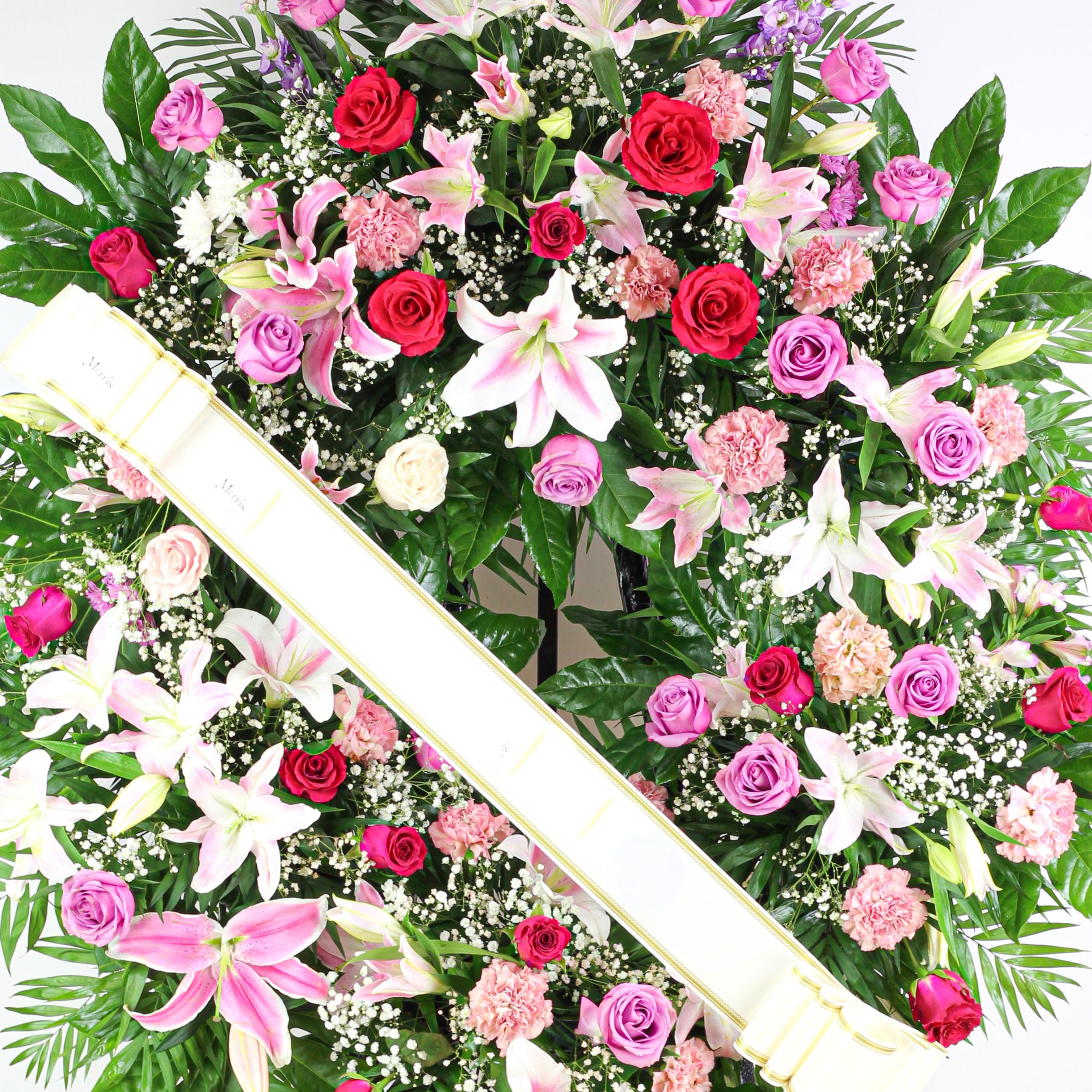 La corona Paradis es una de nuestras coronas mas especiales y lujosas, sus tonos blancos, fucsias, rosados y verdes desprenden luz, amor y condolencias a esa persona especial en momentos difíciles de luto.