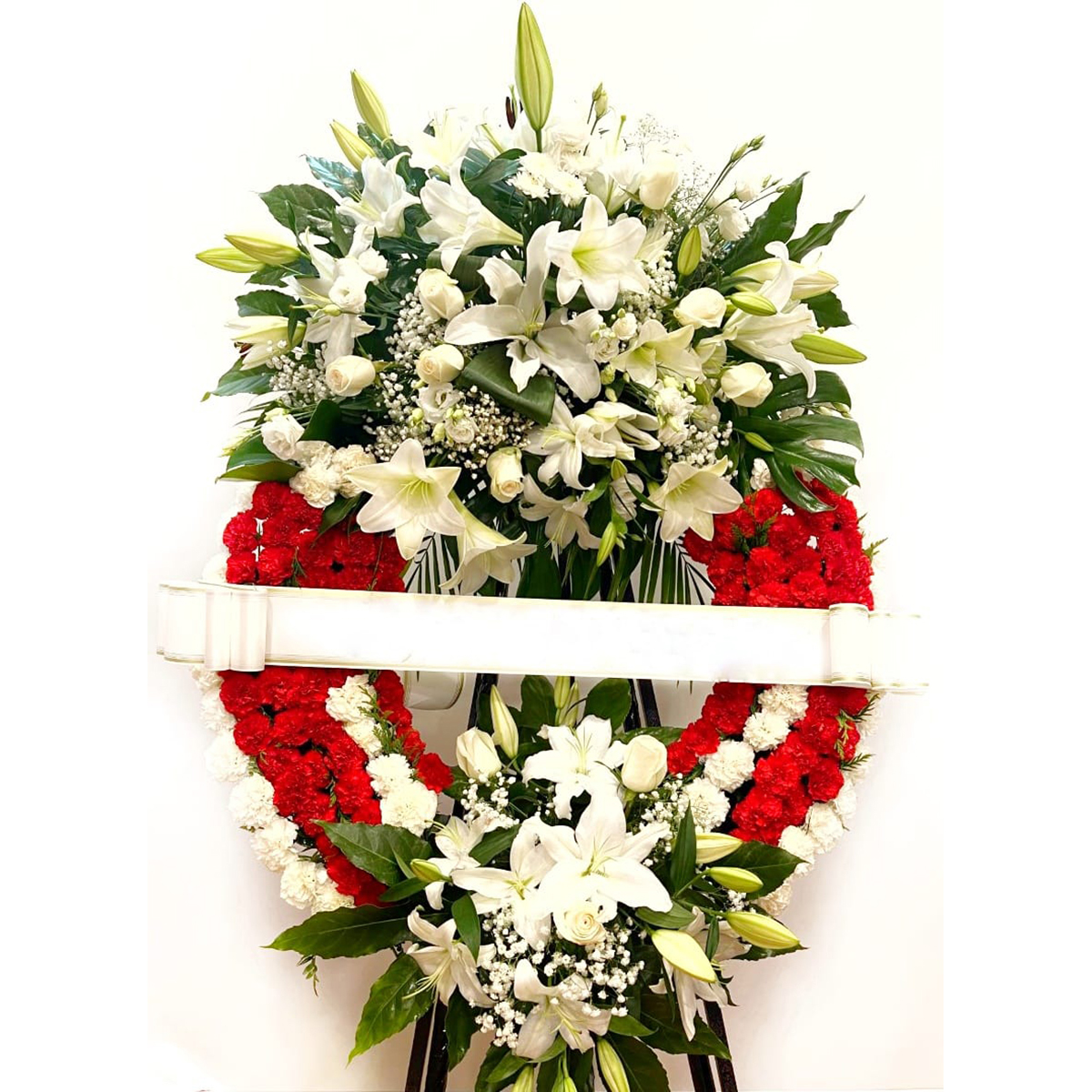 La corona recuerdo eterno es una de nuestras coronas mas solicitadas, sus tonos blancos y rojos desprenden amor y condolencias a esa persona especial en momentos difíciles de luto.
