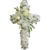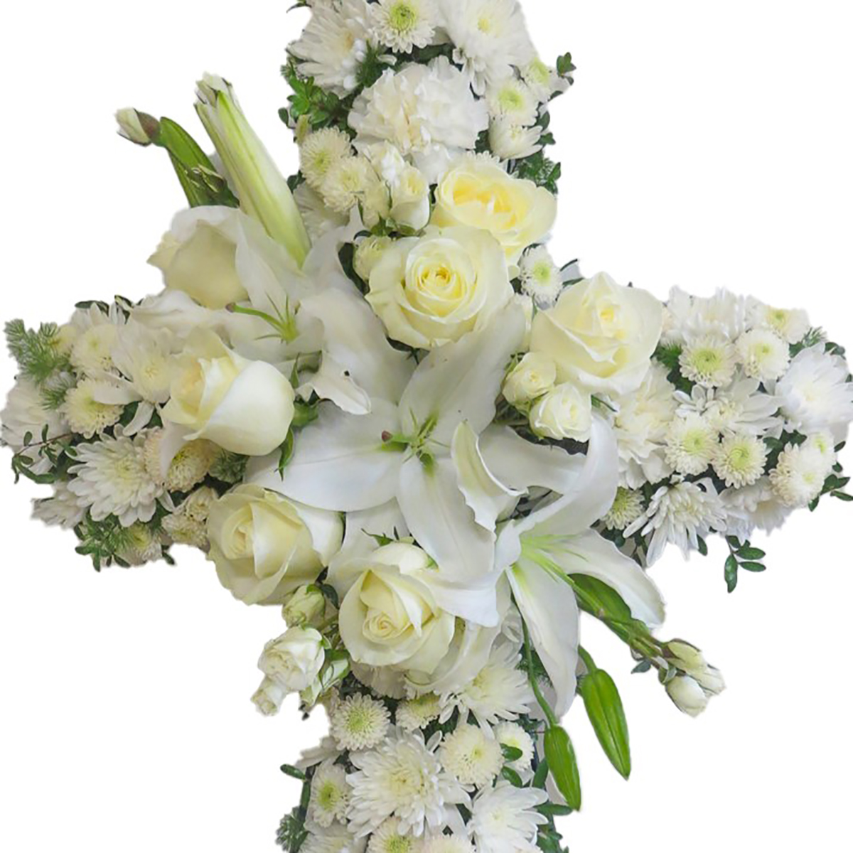 La cruz corazón blanco es un arreglo compuesto por crisantemos blancos con un centro de flores variadas blancas rematado con un surtido de verdes variados. Este arreglo puede tener unas dimensiones aproximadas de 50 a 70 cm de largo dependiendo del tamaño seleccionado.