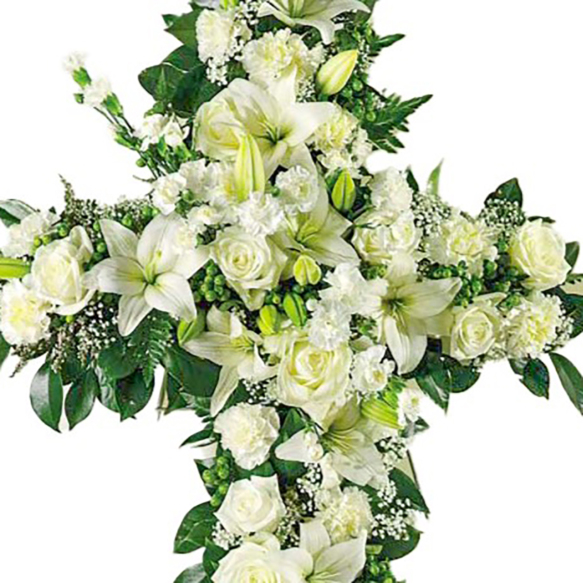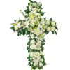 La cruz variada blanca es un arreglo compuesto por flores variadas blancas y complementado con un surtido de verdes variados. Este arreglo puede tener unas dimensiones aproximadas de 60 a 80 cm de largo dependiendo del tamaño seleccionado.
