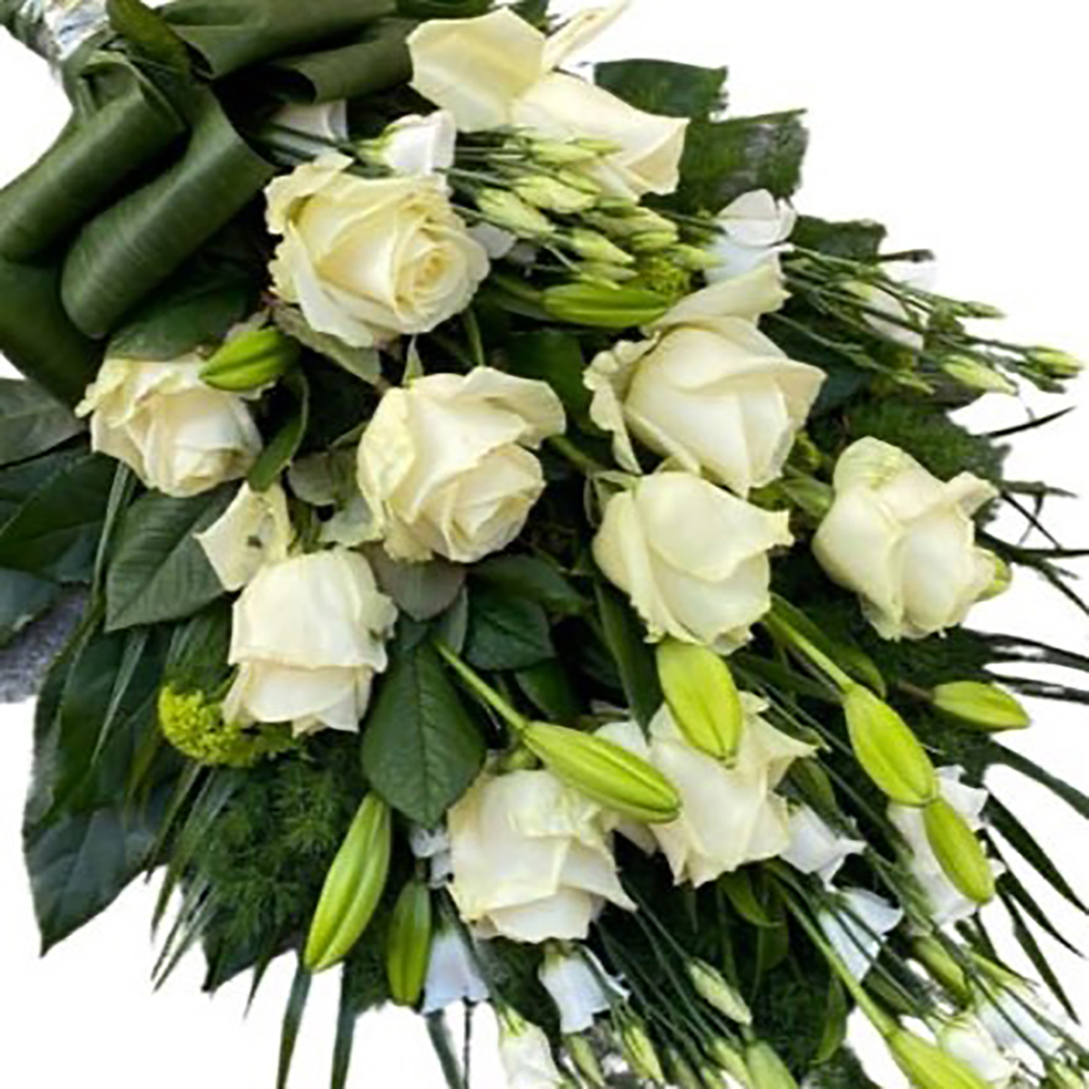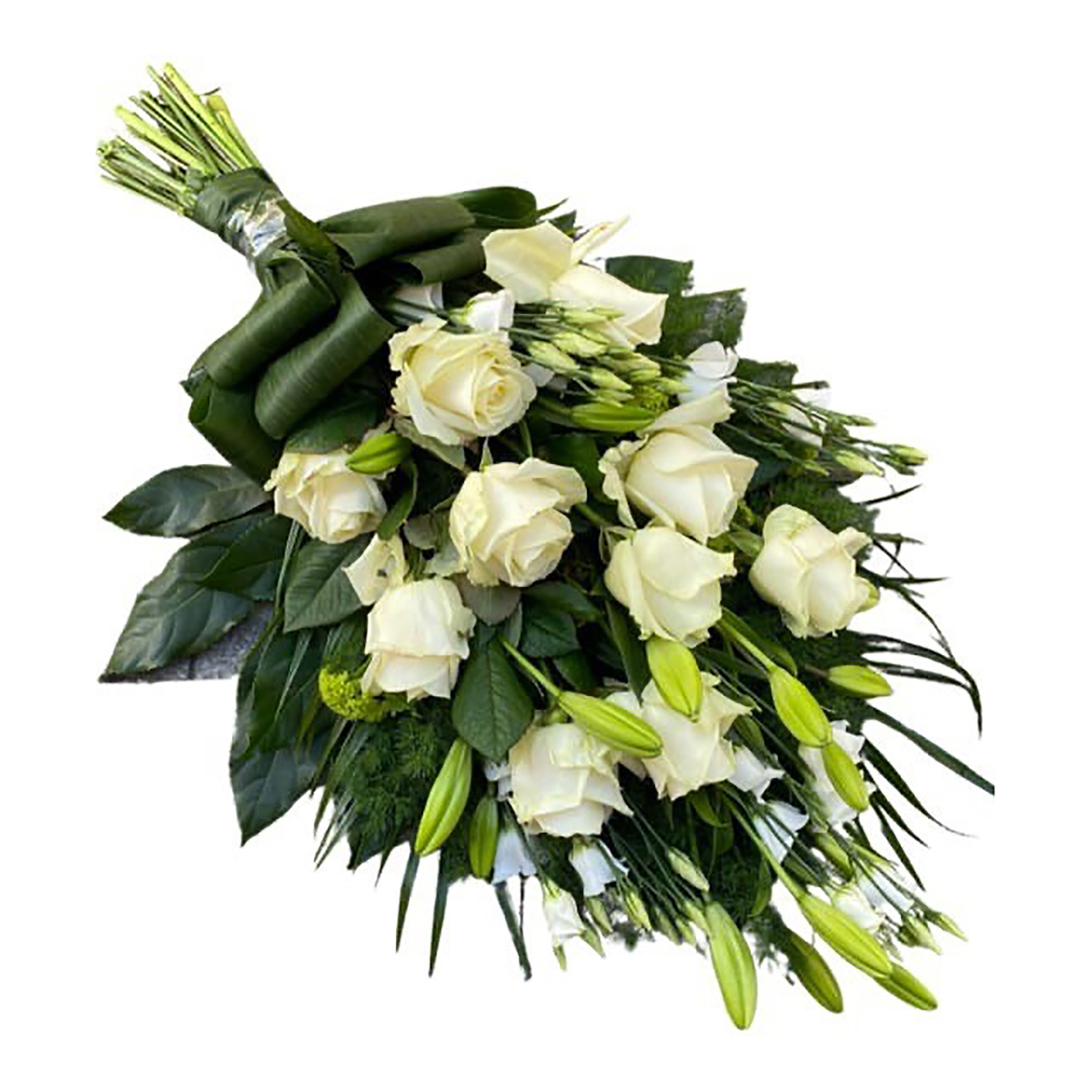 El ramo fúnebre de rosas blancas y lilium es un ramo compuesto por flores variadas con una armonía de colores blancos y un surtido de verdes variados. Las imágenes son orientativas, algunas flores pueden variar de aquellas que aparecen en las imágenes según su temporada y disponibilidad. Nuestros floristas profesionales pueden sustituirlos por otra alternativa similar en estilo, calidad y valor.