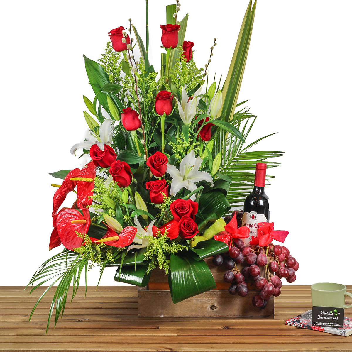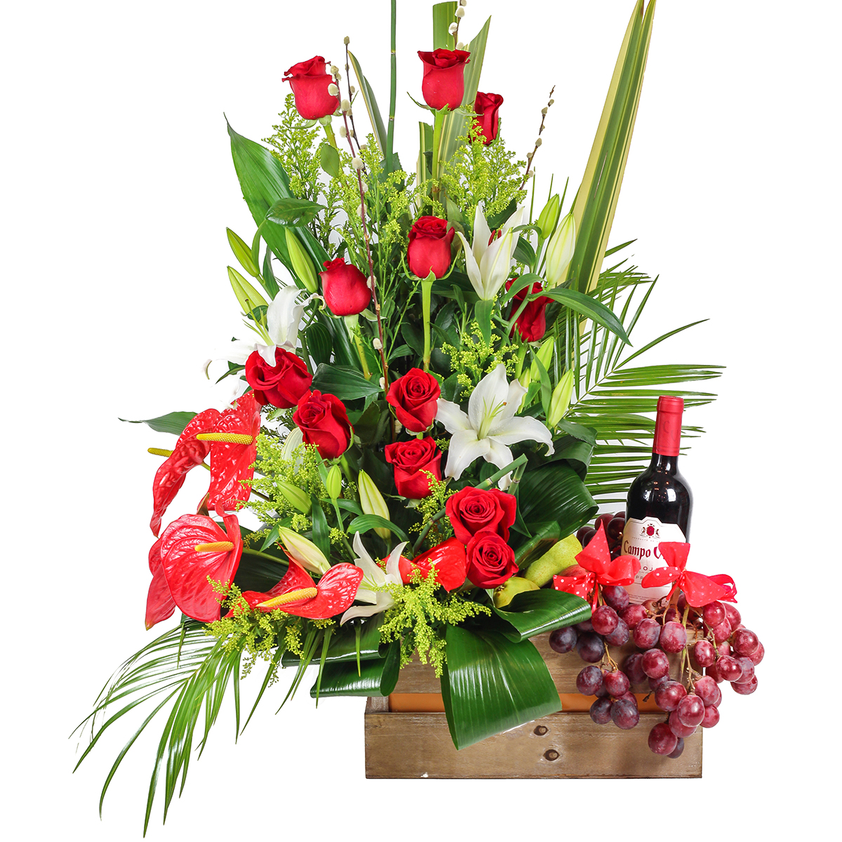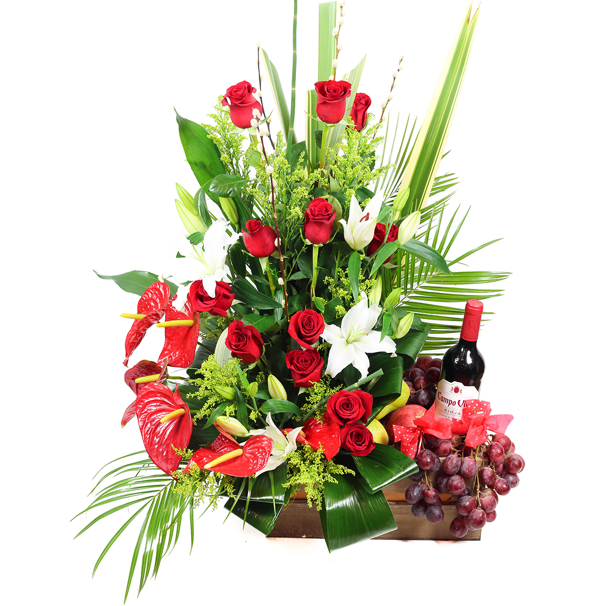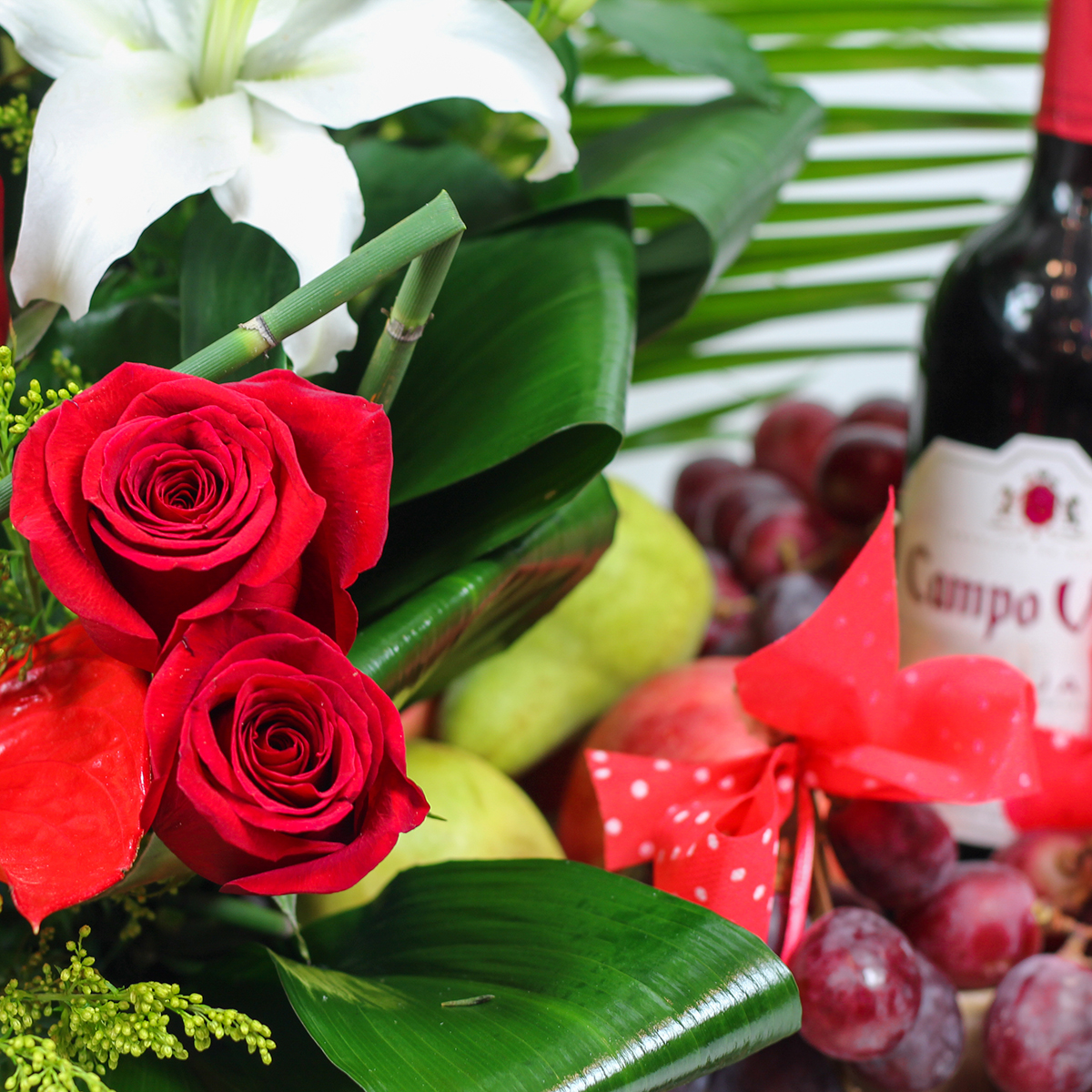 Centro de flores frescas recién cortadas y frutas. Este arreglo esta compuesto con rosas, lilium, anthurium, un surtido de frutas y una botella de vino tinto.