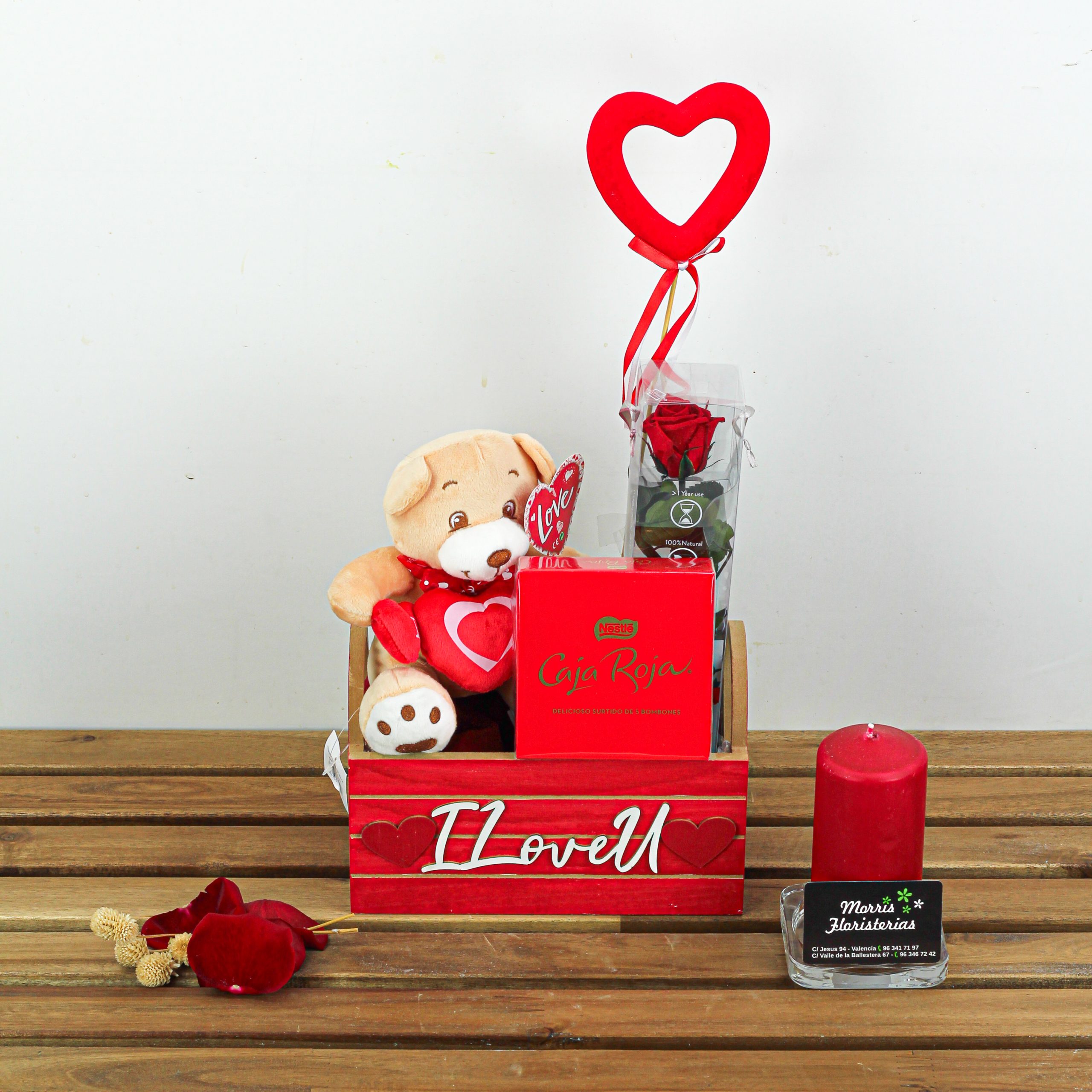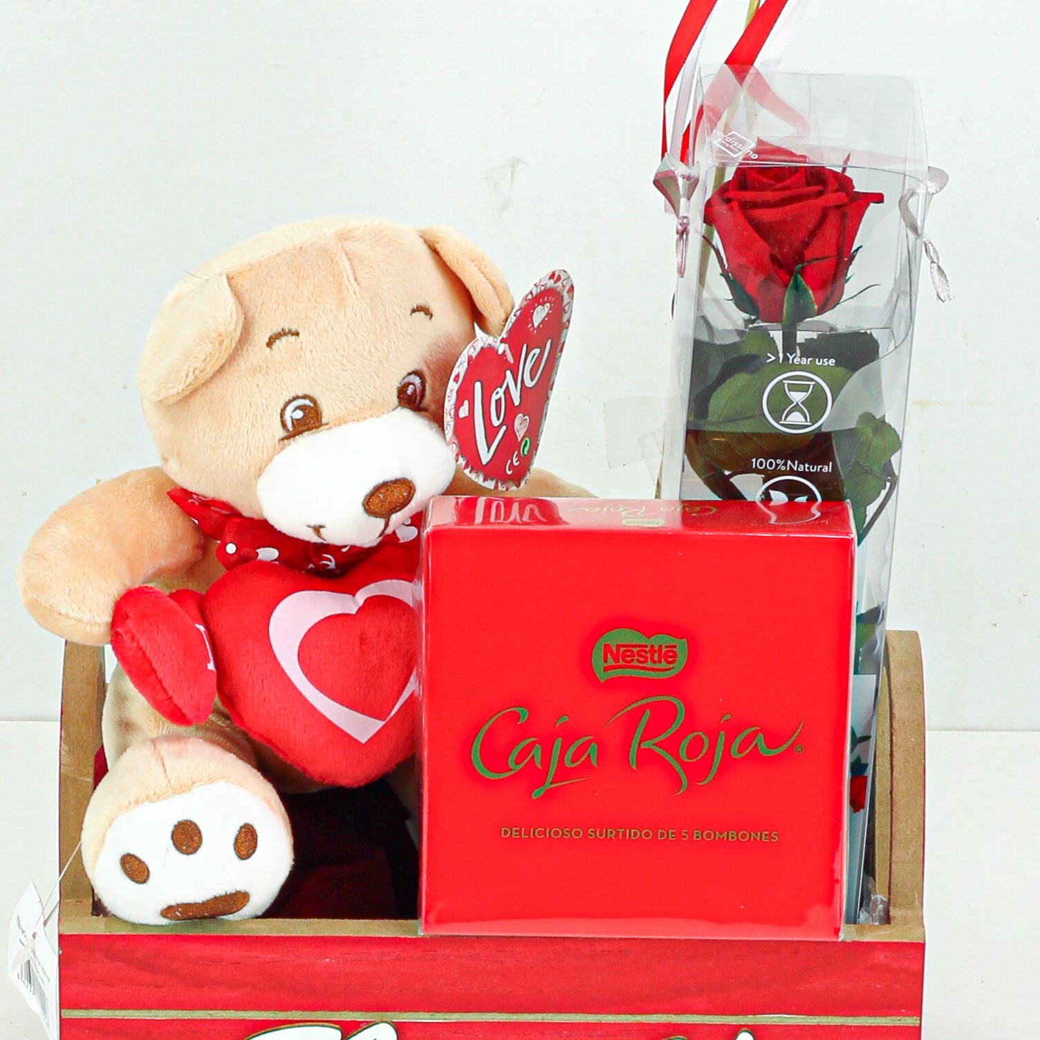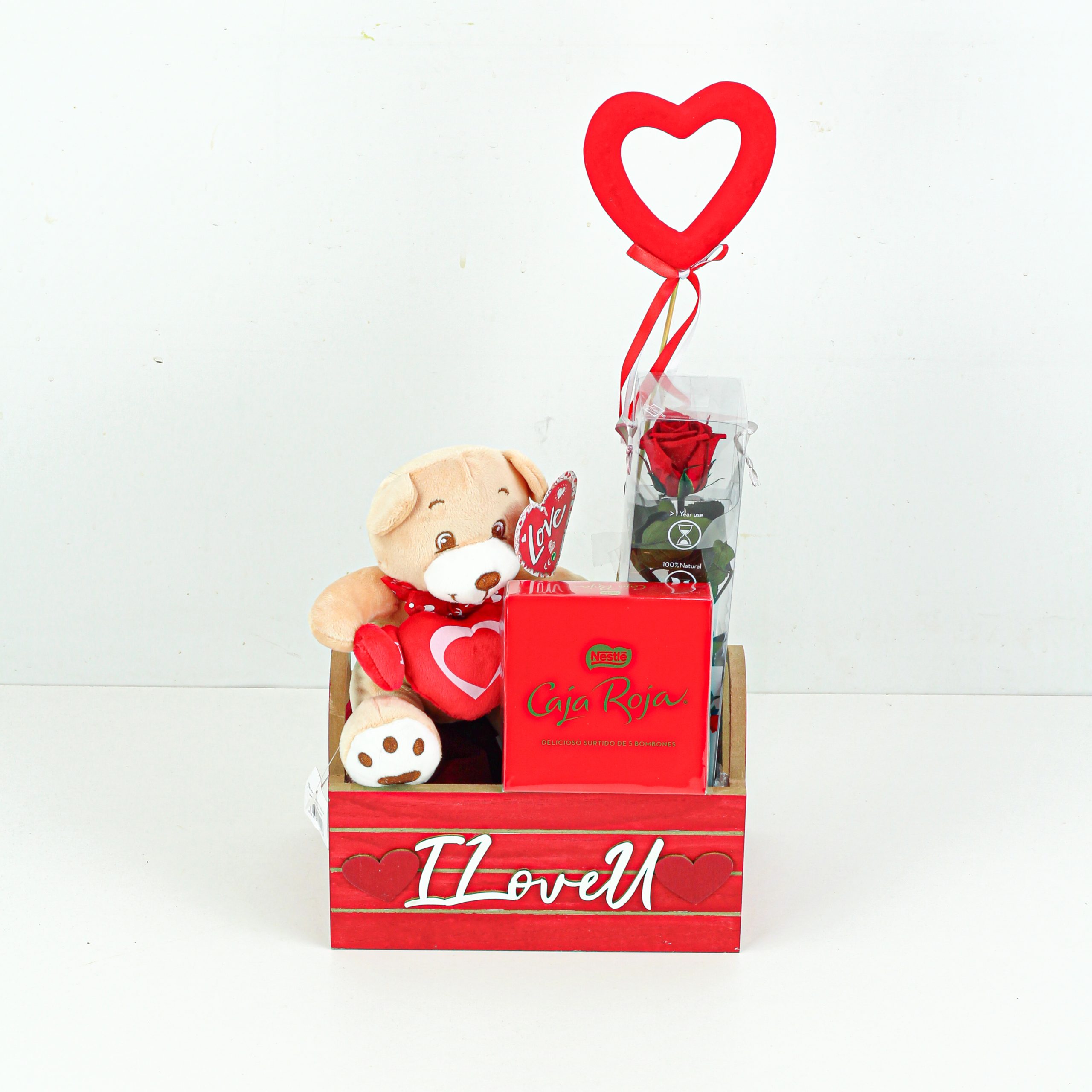 La caja love M es un arreglo en una caja de madera que incluye una rosa roja eterna (liofilizada) de 25 cm de altura, una caja de bombones Nestle caja roja de 45 g, un peluche love de 20 cm de altura y un pick de corazón rojo.