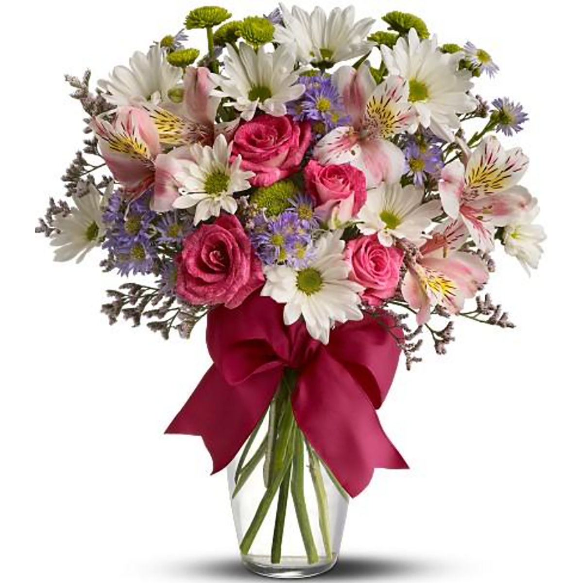 Este encantador ramo de flores frescas está compuesto por una combinación vibrante de colores y formas, cuidadosamente arreglado y con la posibilidad de incluir un elegante florero de vidrio transparente. En el centro del ramo destacan las rosas de color rosa intenso, cuyas capas de pétalos brindan un aire romántico y sofisticado. Estas flores están rodeadas por margaritas blancas con centros amarillos que aportan un toque fresco y alegre al diseño. Así mismo, entre las flores principales se encuentran las astromelias, conocidas como lirios del Perú, que destacan por sus delicados pétalos en tonos rosados y sus característicos detalles de líneas oscuras. Estas flores añaden un aire exótico y refinado al arreglo. El ramo de margaritas blancas cuenta, por otro lado, con pequeñas flores púrpuras de relleno que proporcionan un contraste sutil y elegante, así como hojas y flores de botón verde que completan el diseño, añadiendo textura y un aspecto natural.